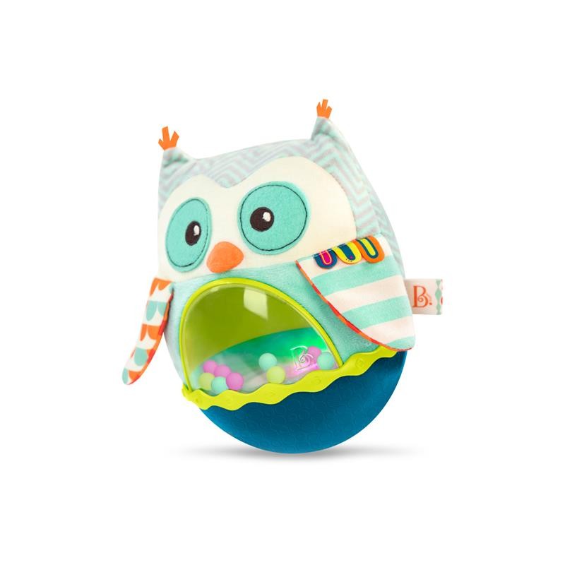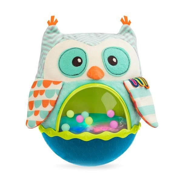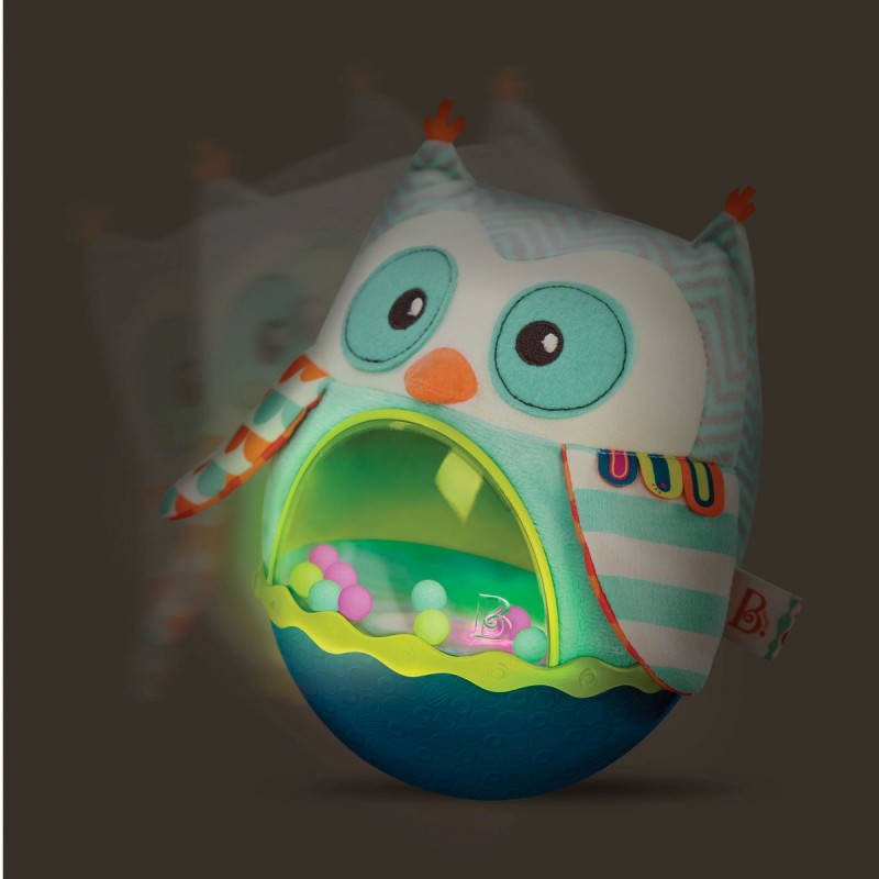 Sensorische Eule - B. Toys - Owl Be Back mit Musik und Lichtern. Die Eule schaukelt unermüdlich - einfach einen kleinen Schubs geben - und fällt nie um. Außerdem verfügt sie über angenehme vorinstallierte Melodien und ihr Bauch ist Schauplatz einer spektakulären Lichtshow mit bunten Kugeln. Dieses Spielzeug ist ideal für Babys, die auf dem Bauch liegen, und für Kleinkinder, die anfangen zu krabbeln. Es stimuliert und fördert die Koordination. Eine tolle Geschenkidee.