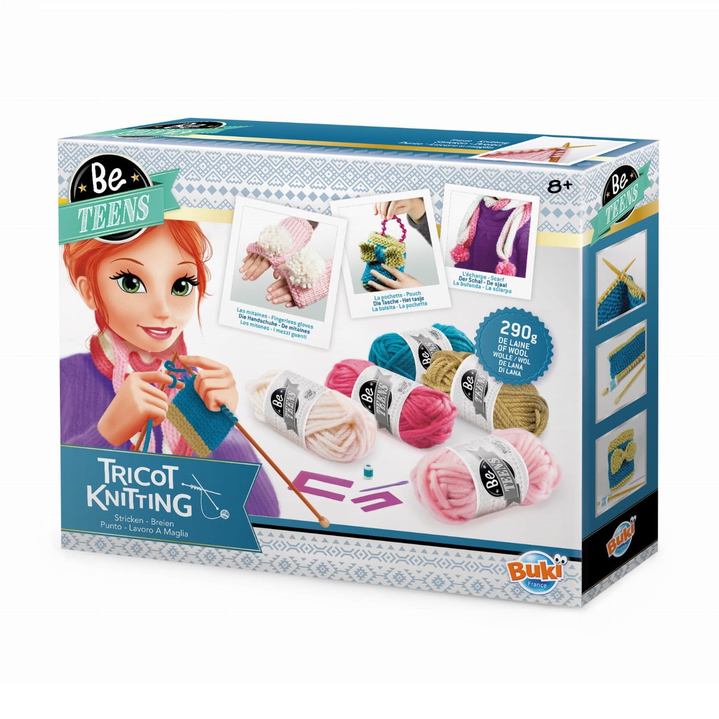 Buki-Strickset – Sie lernen, wie man einen Schal, eine Tasche und fingerlose Handschuhe (Fäustlinge) herstellt. Das Set beinhaltet das Erlernen des Fingerstrickens, des Strickens mit Farbwechsel und das Erlernen des einfachen glatt rechts gestrickten Musters.