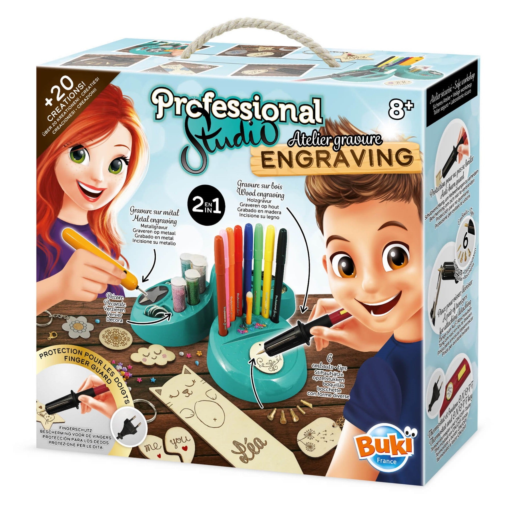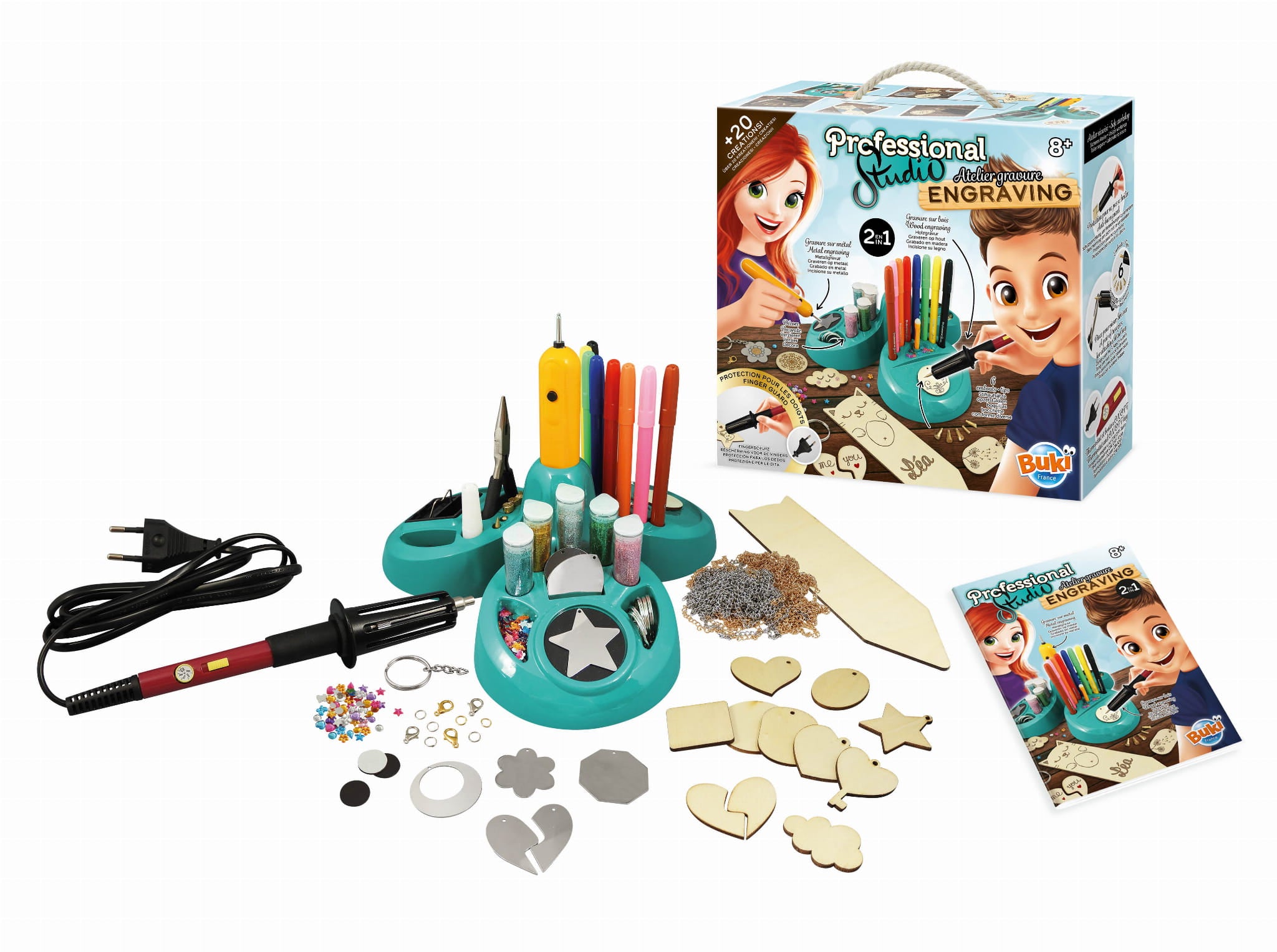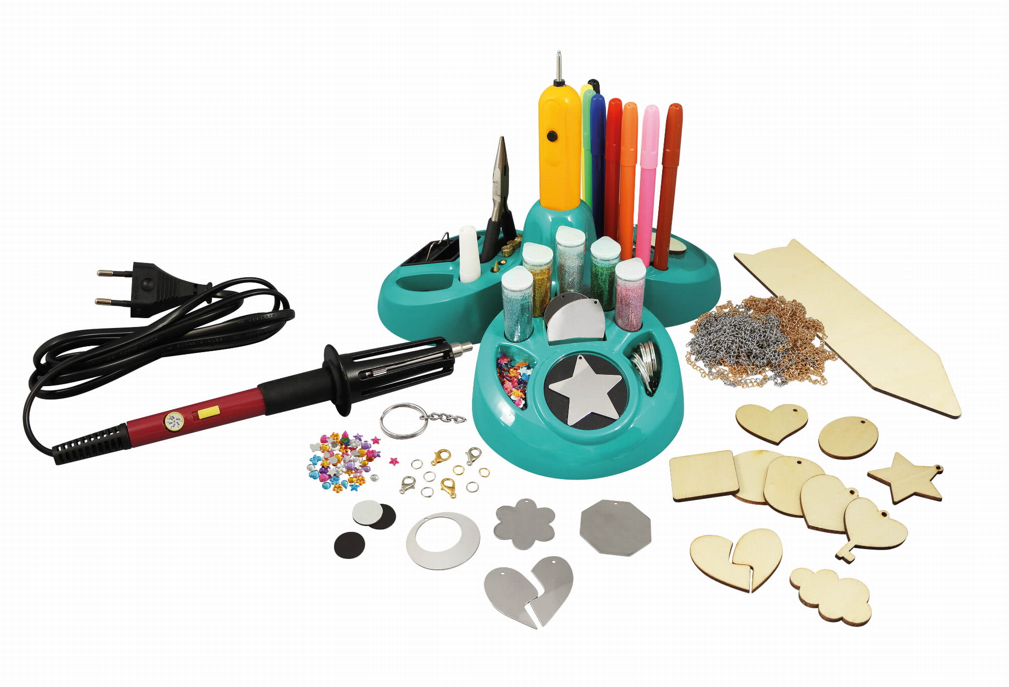 - Enthält: 1 Arbeitsstation - Werkzeugkasten, Holzbrennwerkzeug mit Schutzhülle, Metallgravurwerkzeug, Zange zum Wechseln der Spitzen, 6 Holzbrennspitzen, 5 Glitzerfläschchen, Holz- und Metallelemente zum Verzieren, Magnete zum Verzieren, Ketten, Ringe, Karabinerhaken (Gold und Silber), Marker, Kleber und Zirkone, Schritt-für-Schritt-Anleitung