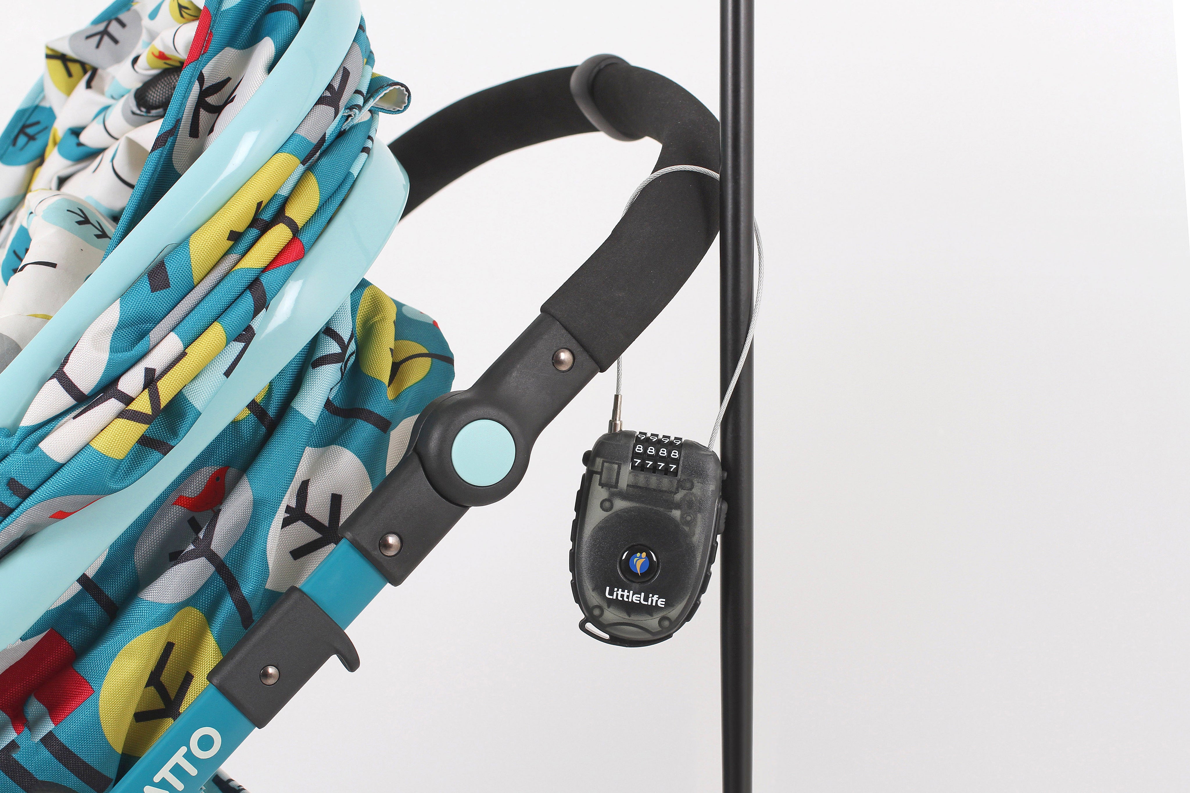 Mit dem Stroller Lock können Sie sicher sein, dass der Kinderwagen oder das Fahrrad, das Sie zurücklassen, an seinem Platz bleibt, bis Sie zurückkehren. Das robuste Seil und das vierstellige Schloss bieten robuste Sicherheit, die einfach und bequem zu bedienen ist.