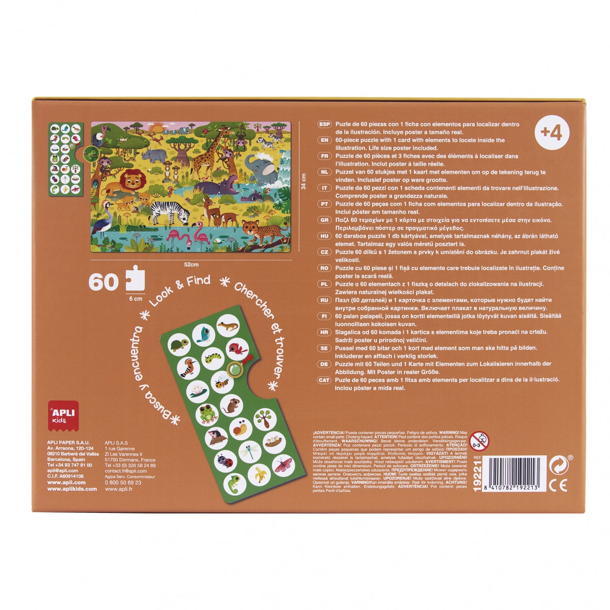 Die Beobachtungspuzzles von Apli Kids sind ein großer Spaß! Die Aufgabe des Kindes besteht nicht nur darin, den Dschungel mit 60 Puzzleteilen zu ordnen, sondern auch Tiere und Pflanzen auf dem Puzzle zu finden (z.B. Schildkröte, Palme, Schmetterling), die auf der dem Set beiliegenden Karte zu finden sind. Ein lebensgroßes Bildposter erleichtert die Handhabung.