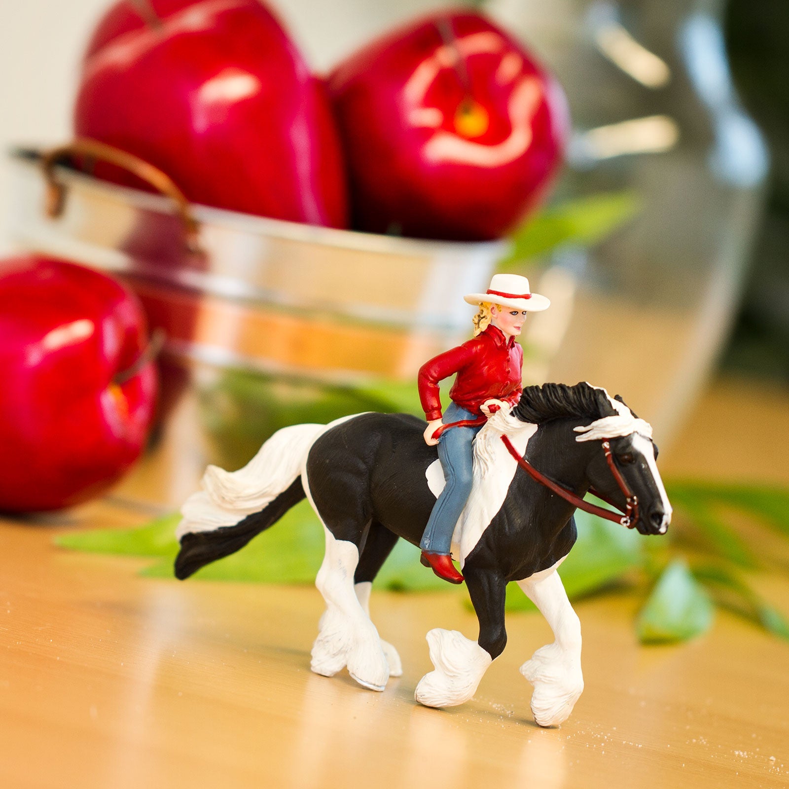 Ein Set aus zwei Spielzeugpferd- und Cowgirl-Figuren von Safari Ltd. Die Figuren der amerikanischen Marke Safari sind handbemalt und professionell gefertigt und zeigen die realistischen Details und einzigartigen Eigenschaften von Pferd und Reiterin.