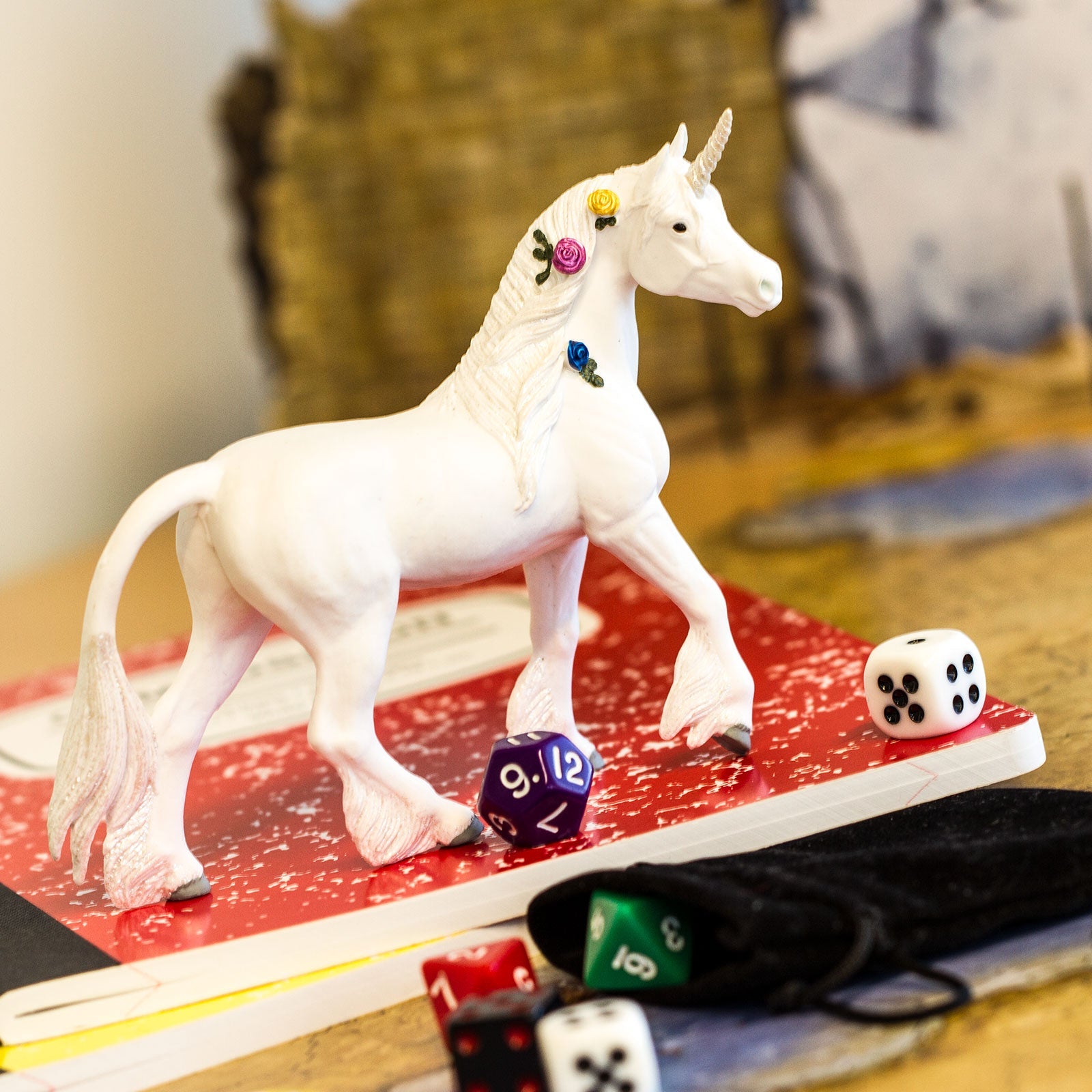 Eine weiße Einhornfigur mit Blumen in der Mähne. Die Figuren der amerikanischen Marke Safari sind handbemalt und professionell gefertigt und zeigen die realistischen Details und einzigartigen Eigenschaften des schönen Einhorns.