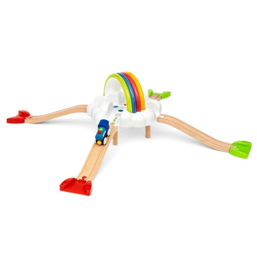 - Das Set enthält: 1 x Holzeisenbahn, 4 x Auffahrtsgleise, 4 x Auffahrten, 1 x interaktiver Regenbogen, 1 x Wolke mit Lichtpunkten