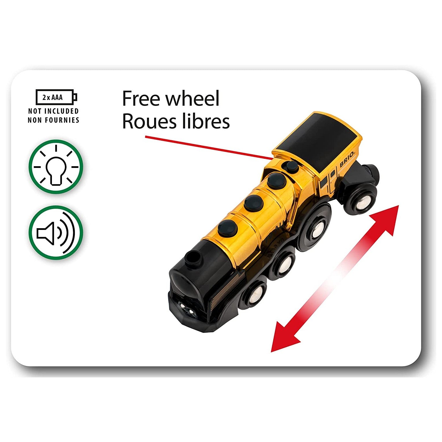 Batteriebetrieb: Dieser batteriebetriebene Spielzeugzug ist einer der stärksten in der Welt von BRIO. Er fährt vorwärts und rückwärts und wird von Licht- und Soundeffekten begleitet. Er verfügt außerdem über einen Schalter an der Oberseite, mit dem man ihn ausschalten kann, sodass man die Lokomotive mit dem Griff steuern kann.