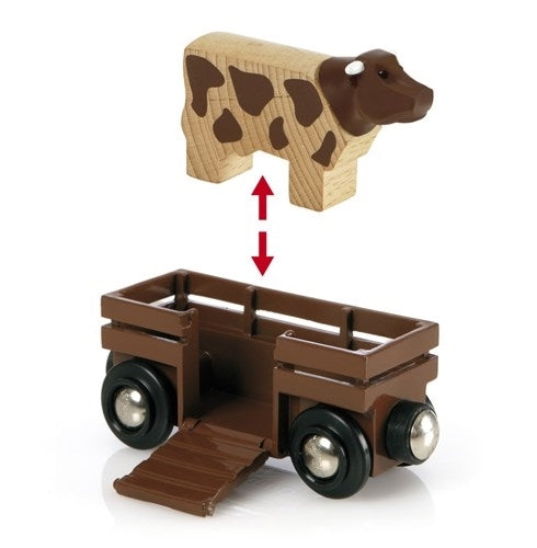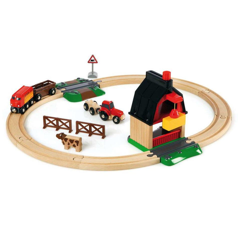 - Das Set enthält: 8x Gleise, 1x Scheune, 1x Motor, 1x Waggon, 1x Traktor, 1x Anhänger, 1x Bahnübergang, 2x Zäune, 1x muhende Kuh, 1x Heuballen, 1x Verkehrsschild