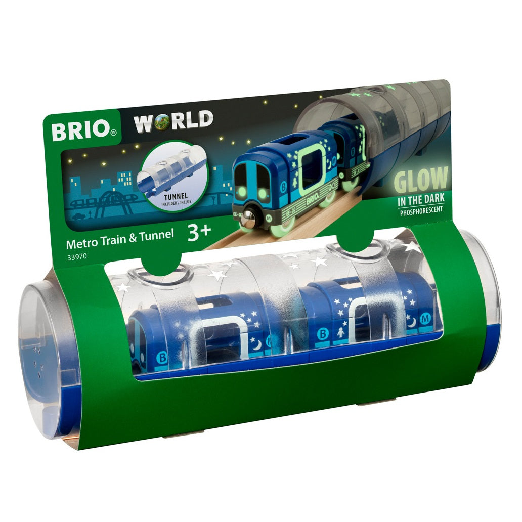 Das Set enthält einen zweiteiligen U-Bahn-Zug und einen speziell entworfenen Tunnel. Die Lichter des Zuges leuchten hell im Tunnel! Die Lokomotive und der Personenwagen können dank ihrer Magnetkupplungen miteinander sowie mit anderen Wagen/Fahrzeugen verbunden werden. An Bord ist ausreichend Platz für zwei stehende BRIO World-Figuren. Der lustige Tunnel, der gleichzeitig als originelle Verpackung dient, hat ein transparentes Dach, durch das man den Zug vorbeifahren sehen kann. Außerdem verfügt der Tunnel über eine leicht zugängliche Funktion, die mögliche Blockaden verhindert.