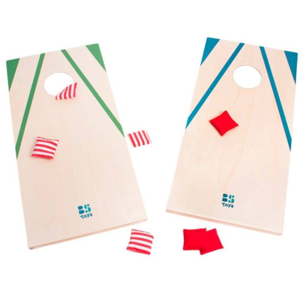 Das Werfen von Beuteln in Löcher in Holzplatten fördert die motorische Koordination, Zielgenauigkeit und Konzentration und regt Kinder und Erwachsene zum gemeinsamen Spielen an. Es ist ein großartiges Teamspiel – man kann eins gegen eins oder in Teams spielen und den Schwierigkeitsgrad an das Alter der Teilnehmer anpassen. Dank der soliden Verarbeitung aus hochwertigem Holz wird das Set viele Jahre lang Freude bereiten und zu einem Lieblingsspielzeug der ganzen Familie werden.