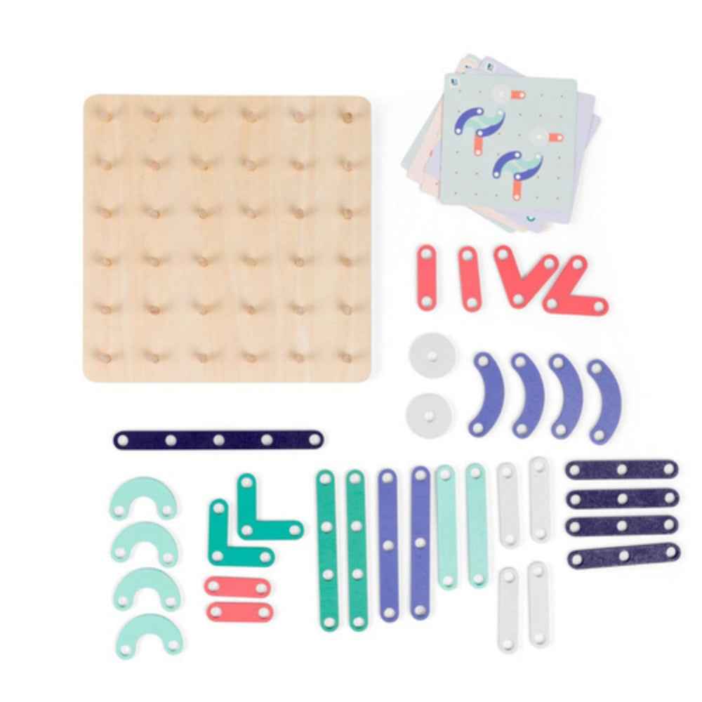 Geoplan – ein bei Kindern und Eltern beliebtes Spiel. Auf einer großen Holztafel sind regelmäßig angeordnete Stifte angebracht. Mit bunten Gummibändern spannen Kinder die Gummis zwischen den Stiften und gestalten dabei Formen und Bilder. Sie können sich an Aufgabenkarten orientieren oder ihrer Fantasie freien Lauf lassen. Jüngere Kinder, die noch keine Muster nachlegen können, dürfen die Gummis frei spannen.