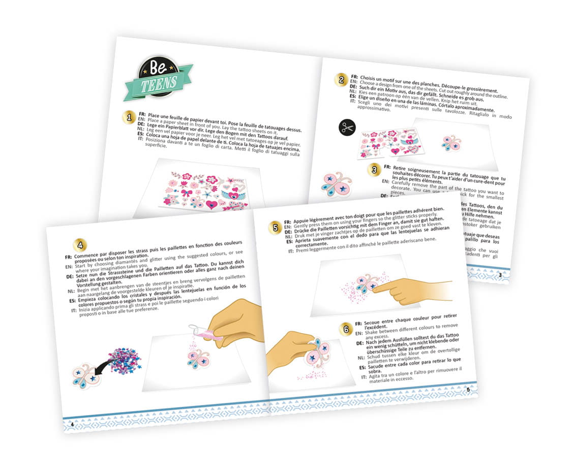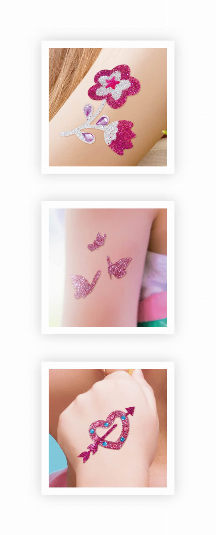 - 2 Bögen mit doppelseitig klebenden Tattoos (eine Seite mit Klebstoff zum Aufkleben von Glitzer, die andere zum Aufkleben auf die Haut),