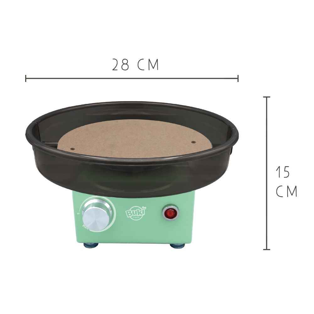 - Lieferumfang: 1 Töpferscheibe, 1 kg lufttrocknender Ton, 5 Werkzeuge aus Holz und Metall, 1 Schwamm, 2 Arbeitsunterlagen, 1 abnehmbare Spritzschutzschale, 1 Netzteil, 1 Inbusschlüssel