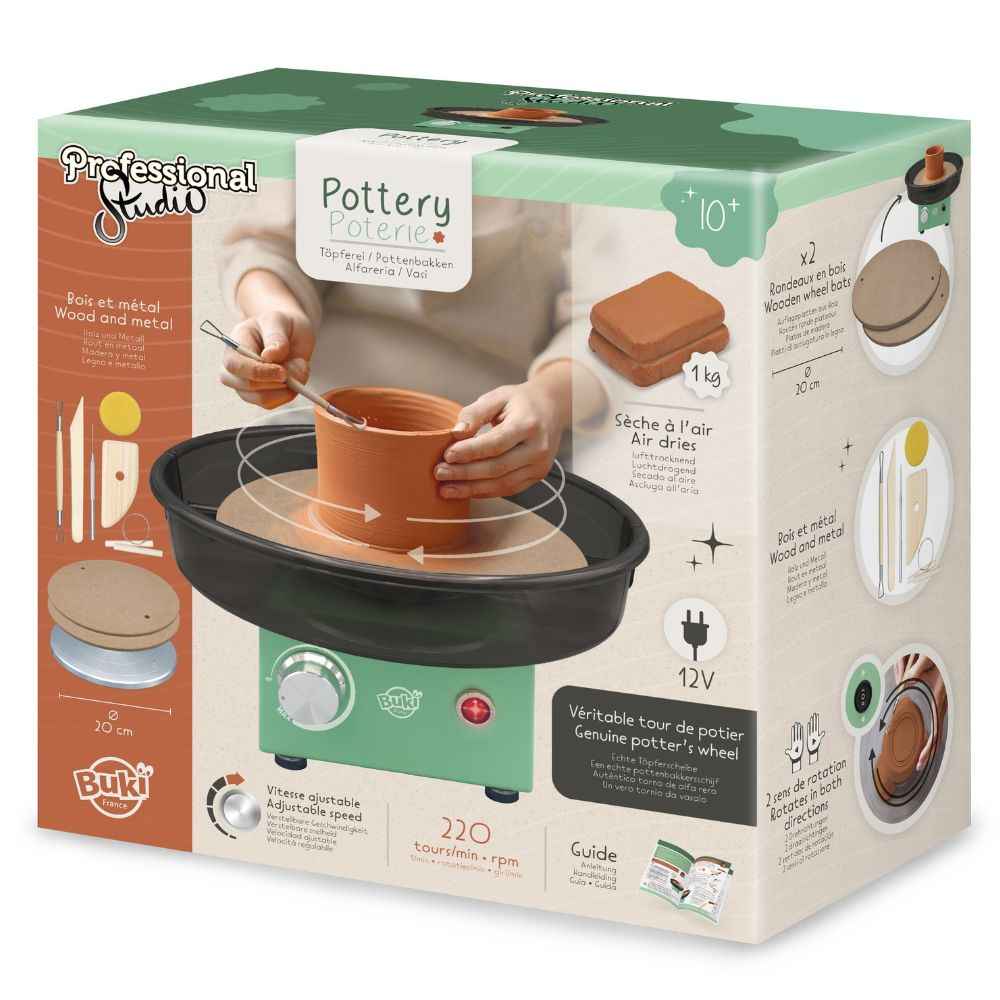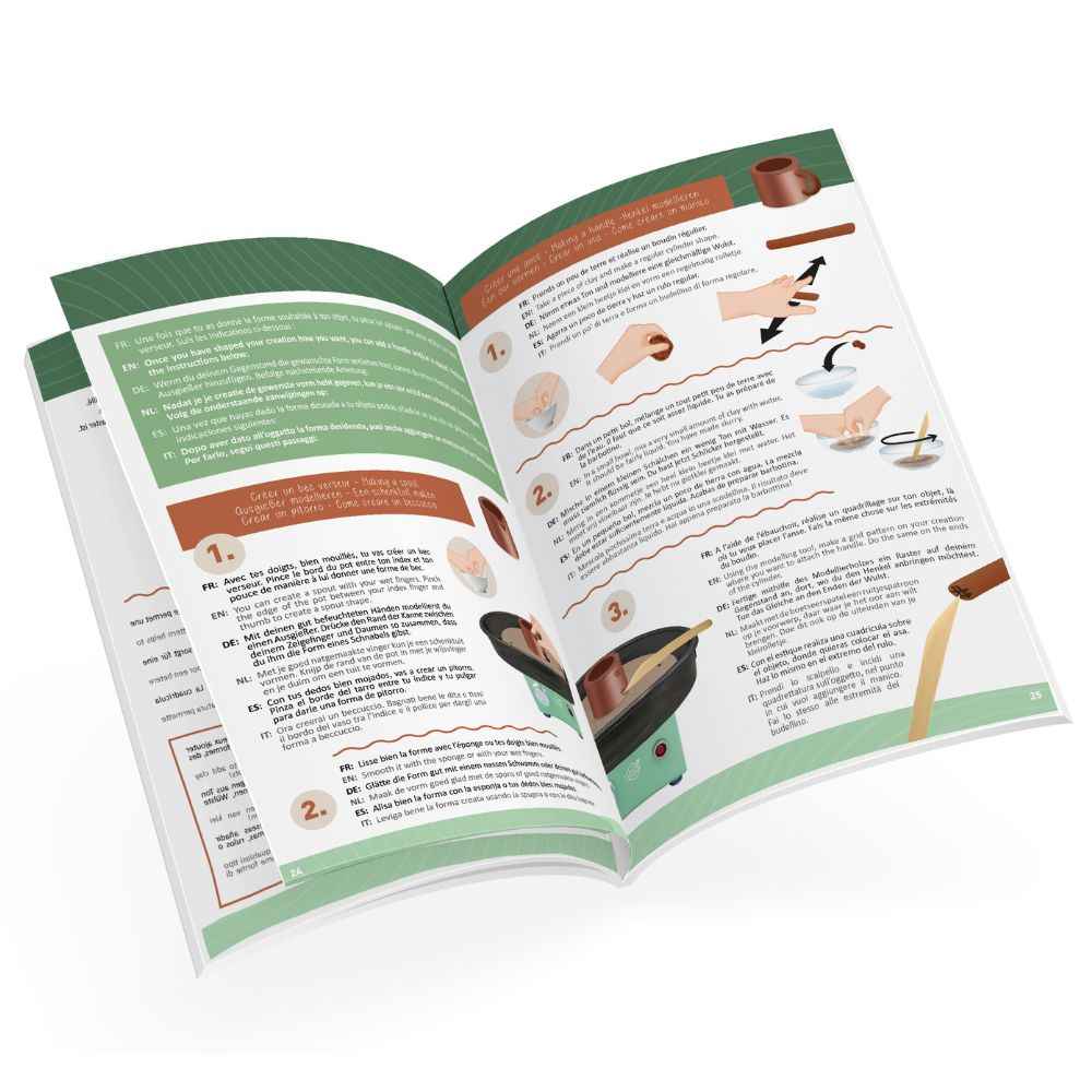 Die Töpferscheibe dreht sich mit 220 Umdrehungen pro Minute und ermöglicht ein komfortables und kontrolliertes Arbeiten. Der Metallkopf mit 20 cm Durchmesser erlaubt die Herstellung verschieden großer Objekte, und der bidirektionale Lauf macht das Set sowohl für Rechts- als auch Linkshänder optimal geeignet. Alle technischen Elemente sind in der Anleitung ausführlich beschrieben – so gelingt der Einstieg auch ohne Vorkenntnisse.