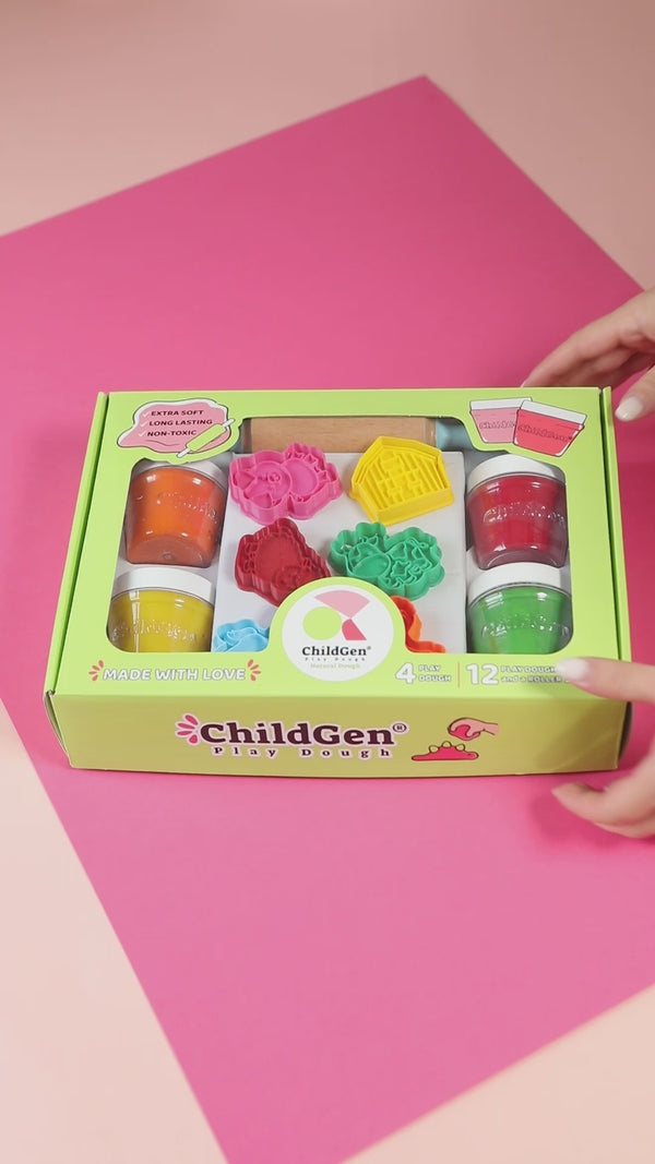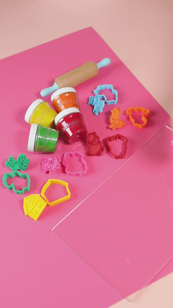 - 4 Farben Knetmasse (gelb, orange, grün und rot), die nur aus natürlichen Zutaten besteht,