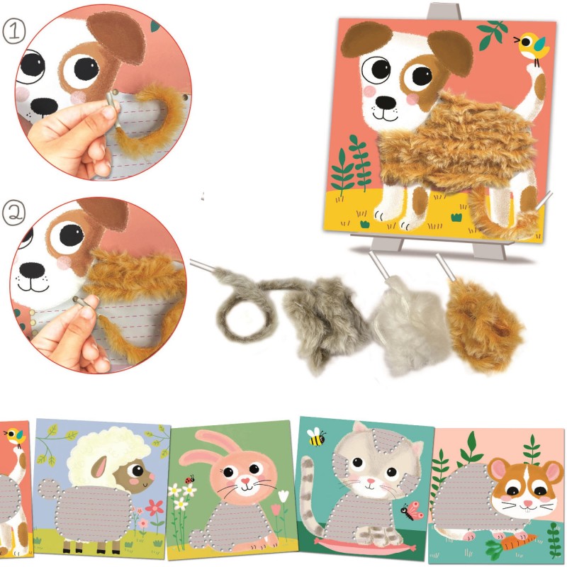 Das Kreativset „Flauschige Tiere vom Bauernhof” enthält 5 Karten mit Tieren, die mit Wolle verziert werden können: ein Hund, eine Katze, ein Schaf, ein Kaninchen und ein Hamster. Dank der großen Elemente zum Auffädeln und der dicken Schnur ist das Spielzeug für Kinder ab 3 Jahren geeignet. Die bunten, fröhlichen Grafiken regen zum Spielen an. Das Kind lernt das Auffädeln, trainiert seine Geschicklichkeit und schafft schöne Bilder.