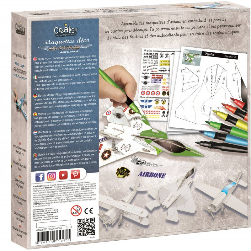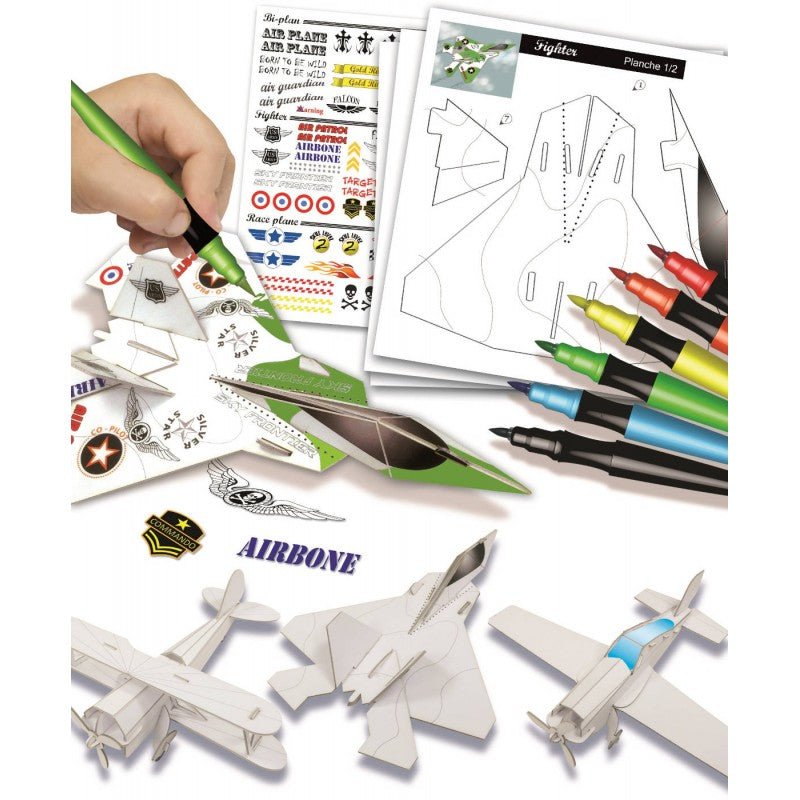 An alle Flugzeugliebhaber! Mit diesem Set können Kinder die vorgestanzten Kartonteile zusammenfügen. Anschließend können sie diese mit den mitgelieferten Markern und Aufklebern bemalen und individuell gestalten, um einzigartige Modelle zu kreieren!
