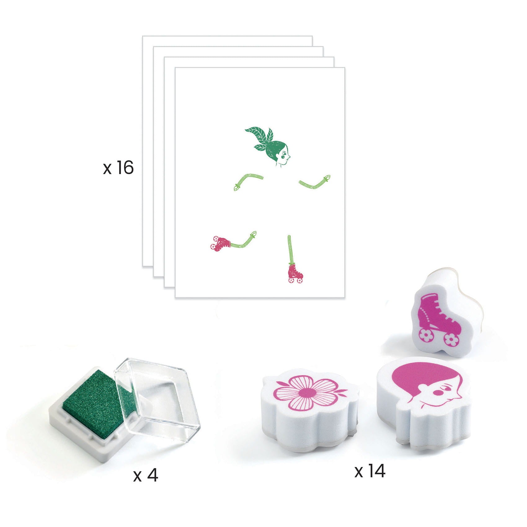 Das Set enthält: 16 illustrierte Blätter zum Ausfüllen (15 x 21 cm), 14 Stempel, 4 Stempelkissen (leicht abwaschbar) in den Farben Orange, Fuchsia, 2 Grüntöne, 1 Schritt-für-Schritt-Anleitung.