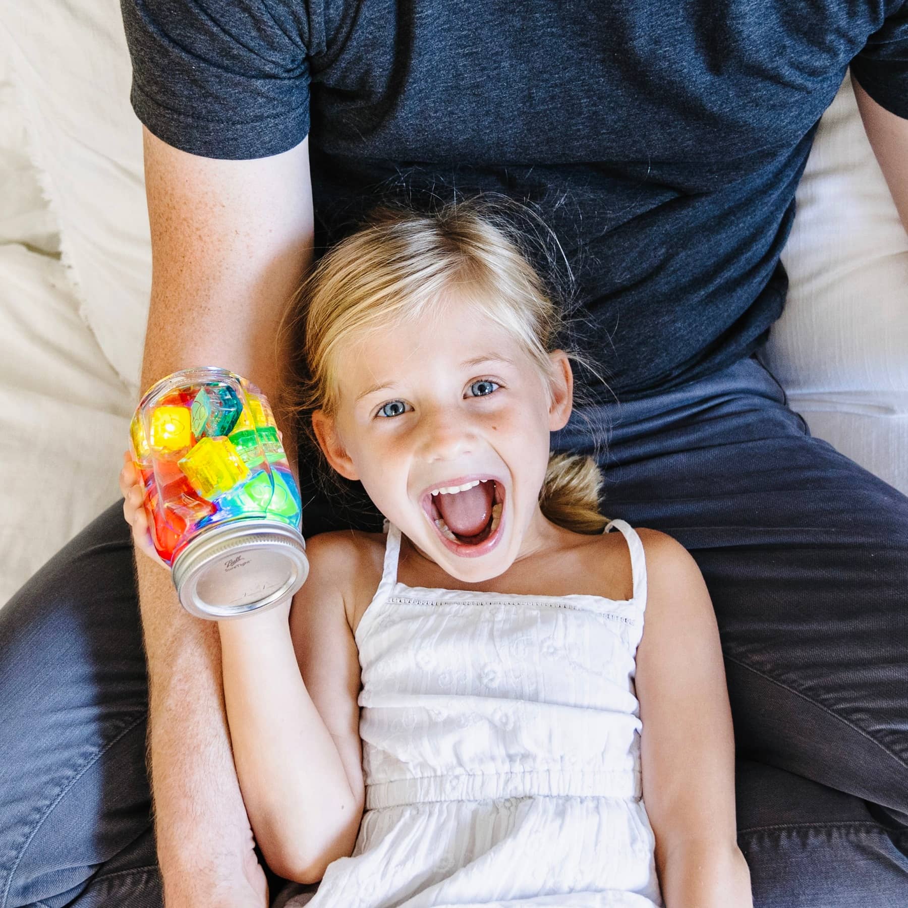 Mit den leuchtenden Würfeln kannst du eine Laterne basteln. Dazu brauchst du nur ein Glas, füllst es mit Wasser und legst die bunten Würfel hinein. Schüttle das Glas und beobachte, wie sich das Licht verändert.