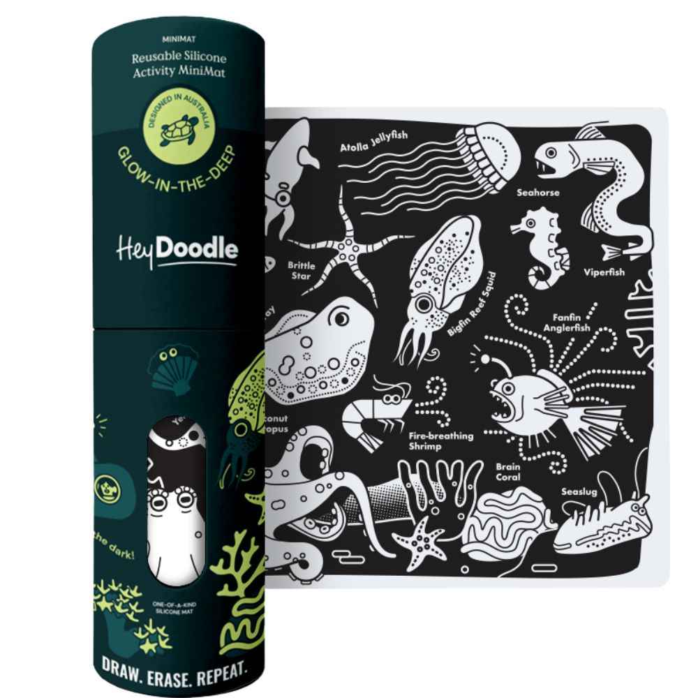 Eigenschaften der im Dunkeln leuchtenden kleinen Silikon-Malunterlage HeyDoodle – Meerestiefen: