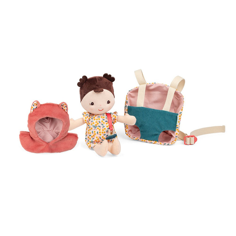 - Inhalt des Sets: Jeanne-Puppe in einem abnehmbaren Strampler mit Magnet-Schnuller, Kapuze-Mütze – Cape mit Ohren, Babytrage mit verstellbaren Trägern