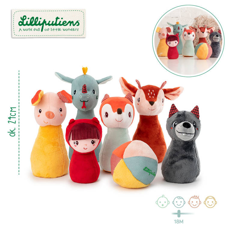 Die Figuren – die Füchsin Alice, das Reh Stella, das Schweinchen Simon, der Drache Joe, der Wolf Louis und Rotkäppchen – haben die Form klassischer Kegel, sind jedoch weich, leicht und farbenfroh. Ihr unterer Teil ist flach und mit einer schweren Füllung versehen, sodass sie aufgestellt werden können. Im Set enthalten ist auch ein bunter Plüschball zum Umwerfen, mit einem Glöckchen im Inneren.