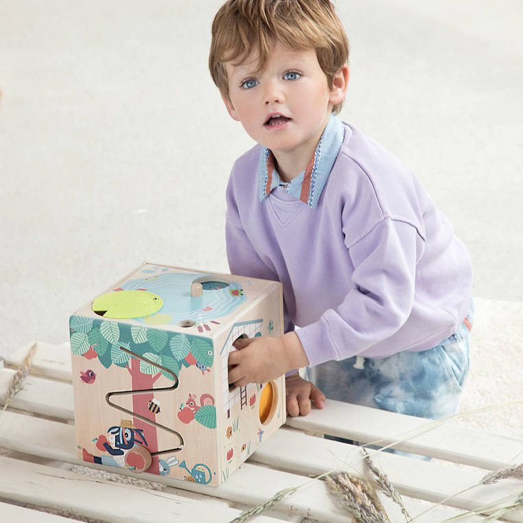Der Aktivitätswürfel „Bauernhof“ der belgischen Marke Lilliputiens ist eine originelle, multifunktionale Quelle der Unterhaltung und des Lernens für neugierige Kleinkinder. Der Würfel hat eine offene Unterseite und auf jeder der übrigen 5 Seiten befinden sich verschiedene Spielmöglichkeiten und Funktionen: