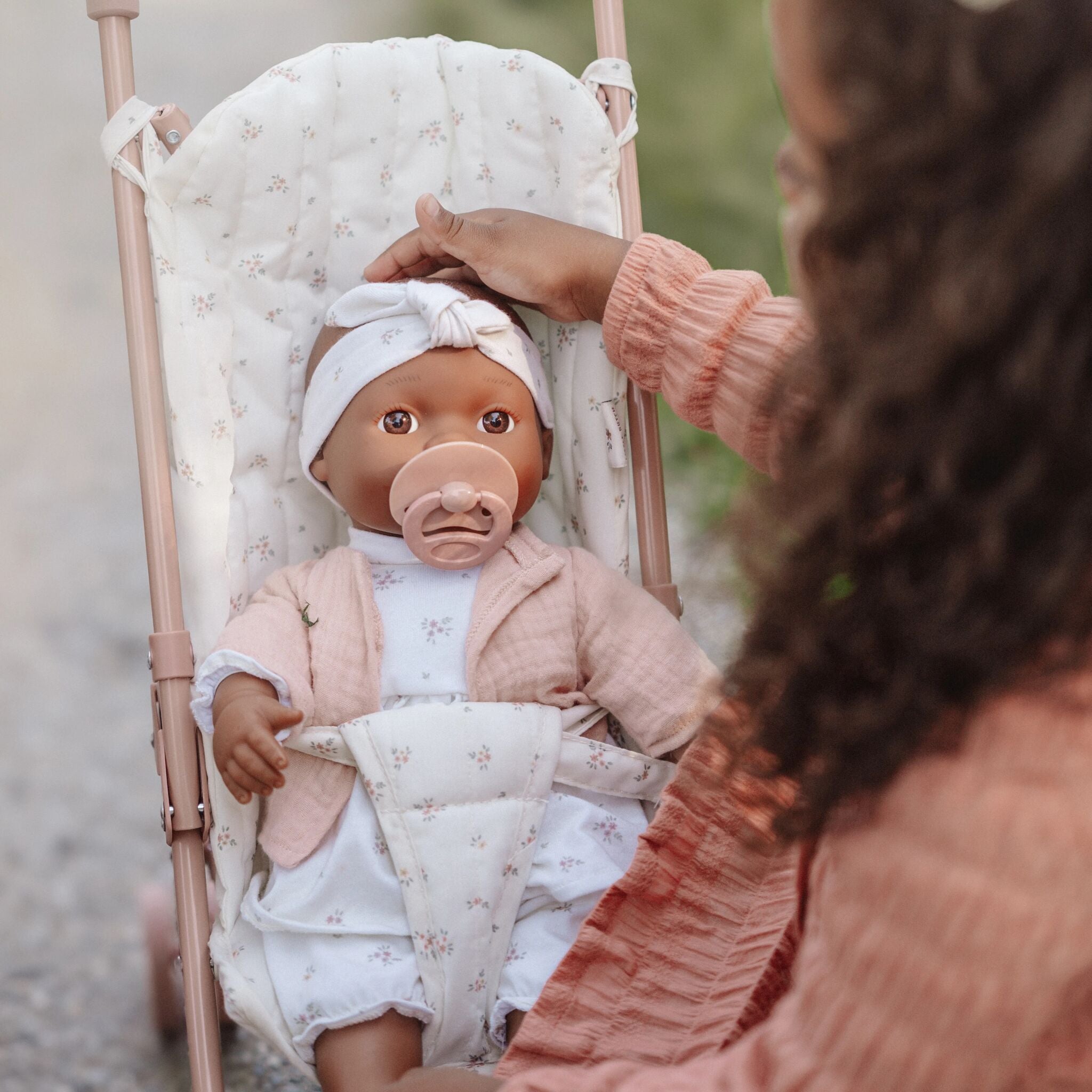 Zusammenklappbarer Puppenwagen von Little Dutch - wohin wird dich deine Fantasie heute führen? Setzen Sie Ihre Lieblingspuppe oder Ihr Kuscheltier hinein und lassen Sie sich vom Kinderwagen in ein neues Abenteuer führen. Der Kinderwagen ist mit einem Stoff mit White Meadows-Muster gepolstert und die passende Tragetasche bietet Platz für Puppenzubehör und Kinderwagenutensilien. Der Gurt sorgt dafür, dass die Puppe während des Spaziergangs nicht herausfällt.