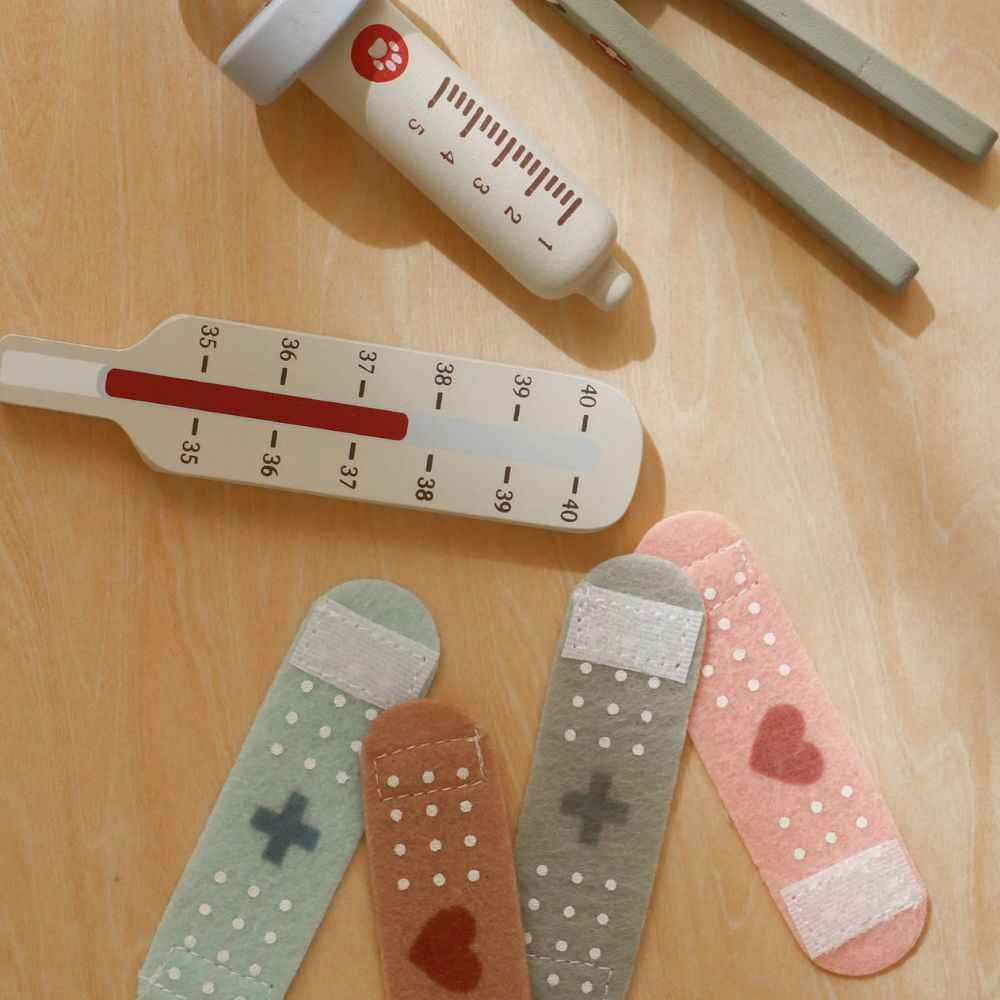 Das Set enthält eine Vielzahl realistischer Accessoires – vom Stethoskop, Thermometer und Spritzen bis hin zu Schutzkragen, Pflastern und Röntgenkarten. Auch Pflegeprodukte wie Bürste, Cremes oder Seife sowie ein Waschbecken zum Händewaschen sind enthalten. Jeder Patient, der den Besuch tapfer übersteht, erhält eine leckere Belohnung! Das Spielzeug regt die Fantasie an, fördert die motorischen Fähigkeiten und unterstützt auf spielerische Weise das Lernen, sich um andere zu kümmern.