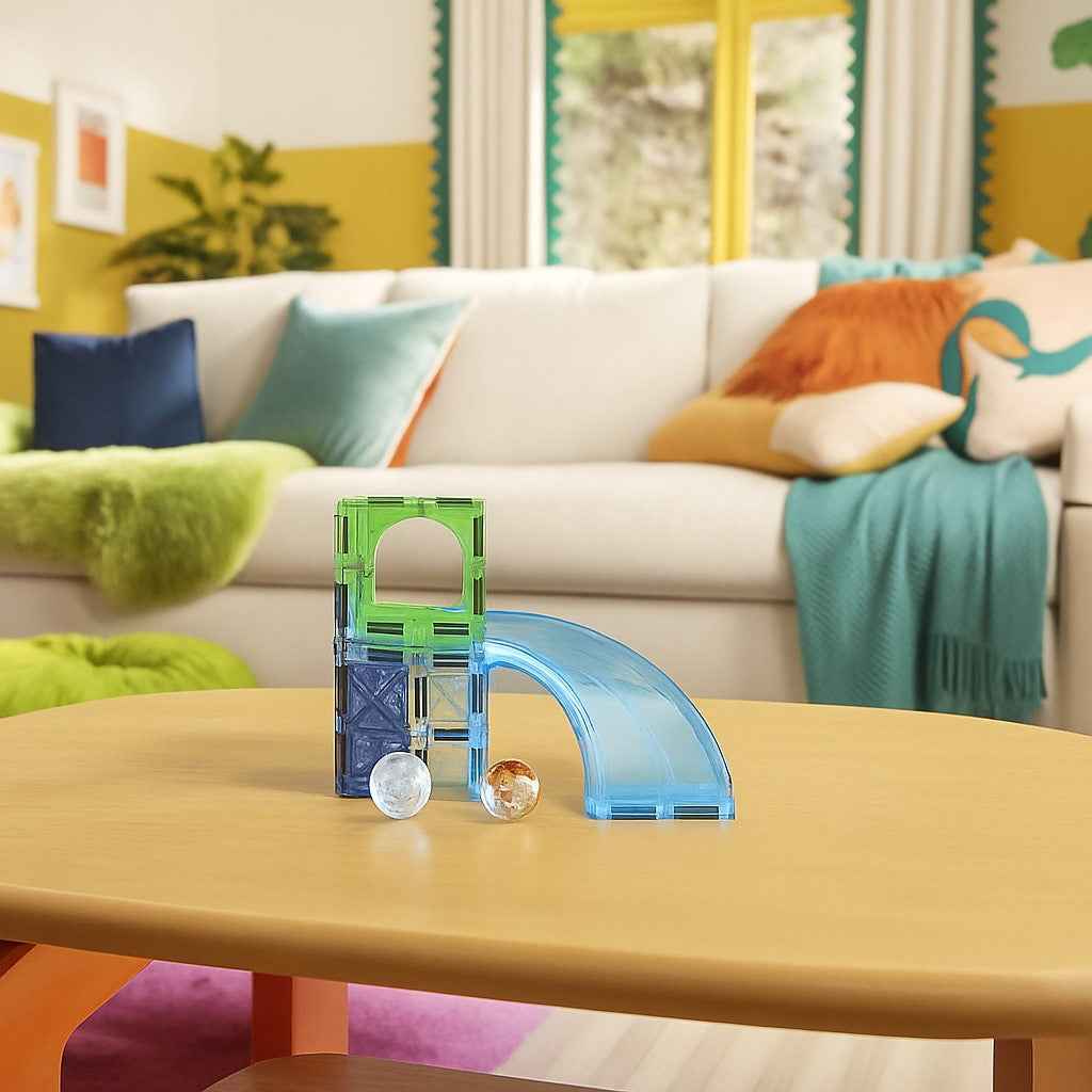 Das Magna-Tiles® Magnetbaukasten-Set enthält farbenfrohe, spiegelnde Platten, die wie kleine Glasstücke wirken. Die Elemente verbinden sich über starke Magnete an den Kanten – so entstehen stabile Konstruktionen, die das Bauen auf ein neues Niveau heben.