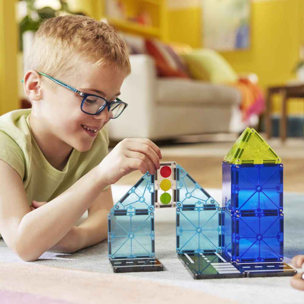 Das Set magnetischer Bausteine Magna-Tiles enthält farbenfrohe, durchsichtige Platten, die an Glasfenster erinnern. Die Elemente verbinden sich mithilfe starker Magnete an den Kanten, wodurch stabile Konstruktionen entstehen und das Bauen eine völlig neue Dimension erhält.