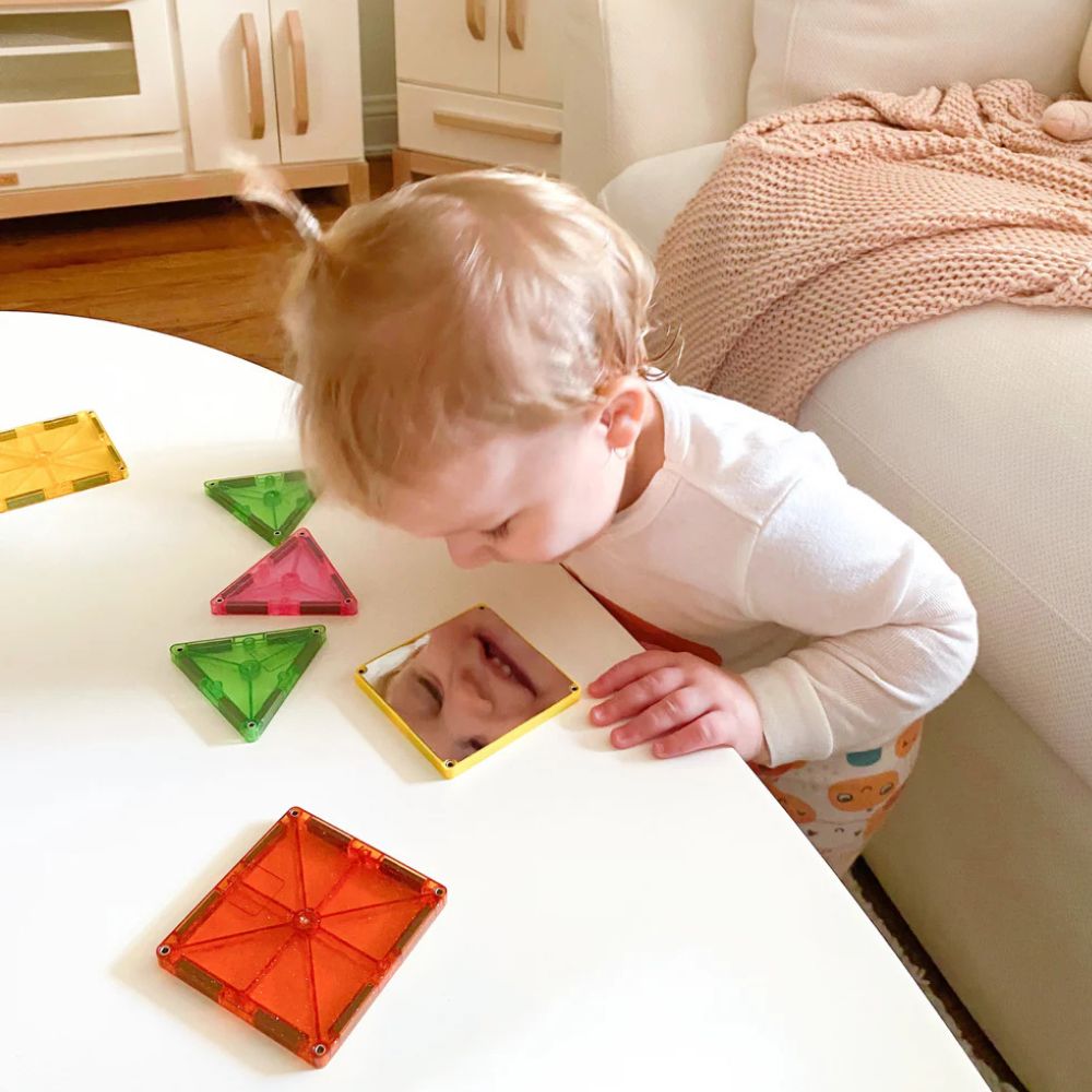 Das Set magnetischer Bausteine Magna-Tiles enthält farbenfrohe, spiegelnde Platten, die an Glasfenster erinnern. Die Elemente verbinden sich über starke Magnete an den Kanten, wodurch stabile Konstruktionen möglich sind und das Bauen eine völlig neue Dimension erhält.
