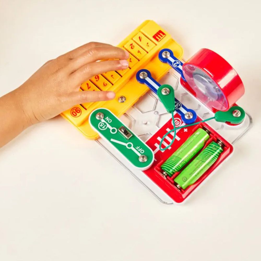 Mit diesem Lernset spielt Ihr Kind nicht nur mit Klängen, sondern baut tatsächlich sein erstes Musikinstrument. Schritt für Schritt verbindet es die bunten Elemente auf der Platine, schließt den Lautsprecher und die Tastatur an und spielt dann seine eigenen Melodien! Das ist eine großartige Möglichkeit, Ihr Kind zum Experimentieren anzuregen, Fragen wie „Was passiert, wenn ...?“ zu stellen und erste Erfahrungen mit Elektronik in einer sicheren, spielerischen Form zu sammeln.