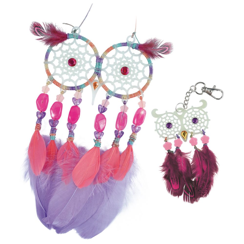 - Inhalt des Sets: 2 Traumfänger-Basen in Eulenform (leuchten im Dunkeln), 2 Farben Baumwollfaden, 18 Federn, 27 Perlen, 6 Aufkleber mit Kristallen, Schmuckkleber, Ring mit Kette, Montagering (Jump Ring), die ganze Geschichte von Petulia, farbige Schritt-für-Schritt-Anleitung