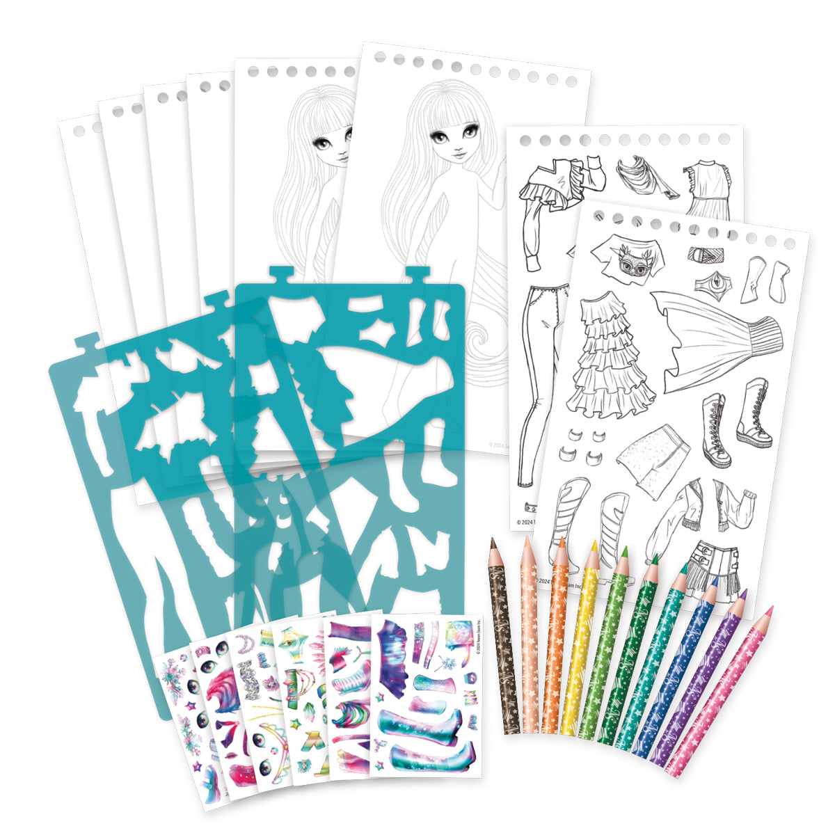 - Umfangreiches Zubehörset – Schablonen, Aufkleber, Buntstifte – Das Set enthält 2 Bögen mit Schablonen mit insgesamt 28 Elementen, 100 Modeaufkleber, 10 Buntstifte und eine illustrierte Anleitung. So hat das Kind sofort nach dem Auspacken alles, was es für kreatives Spielen braucht.