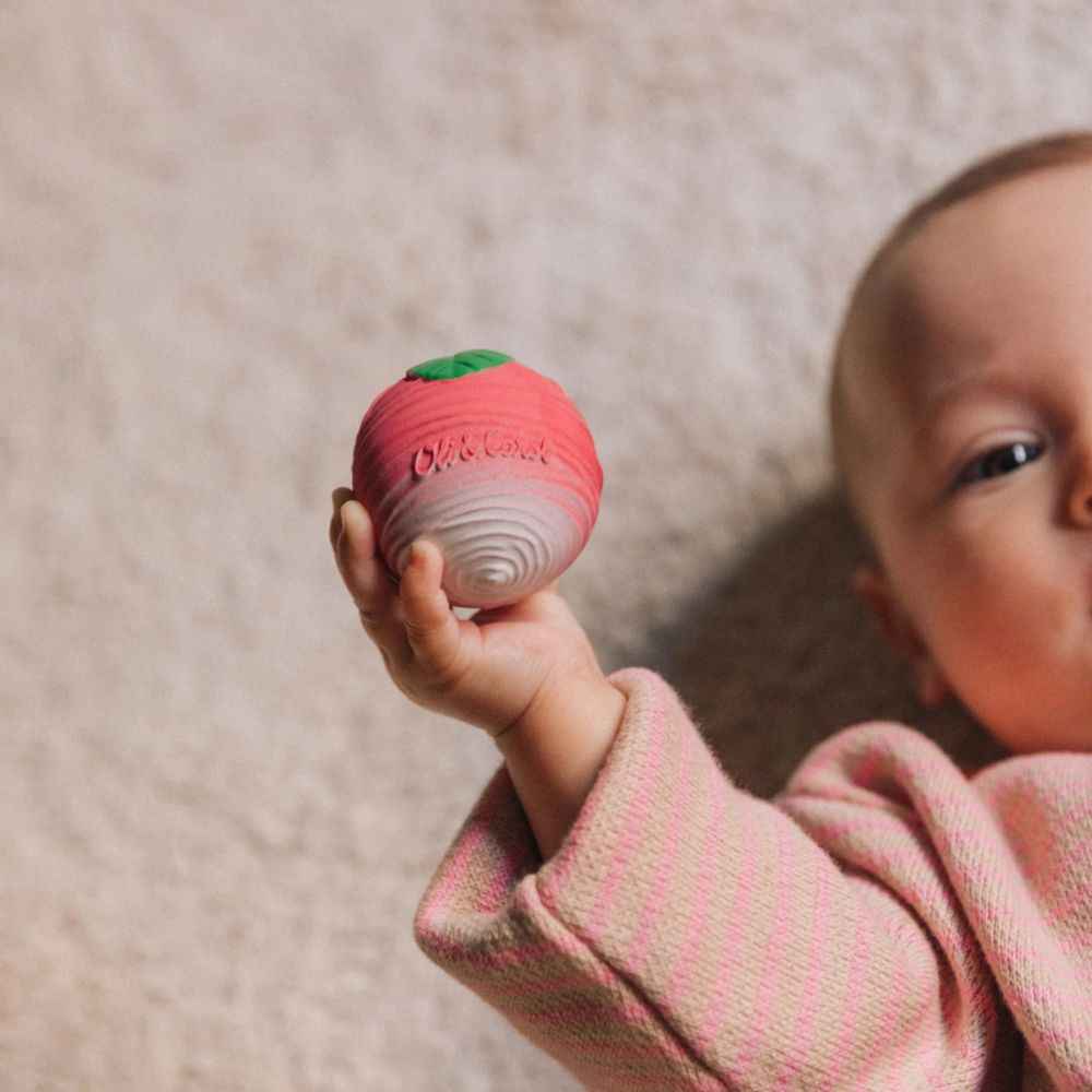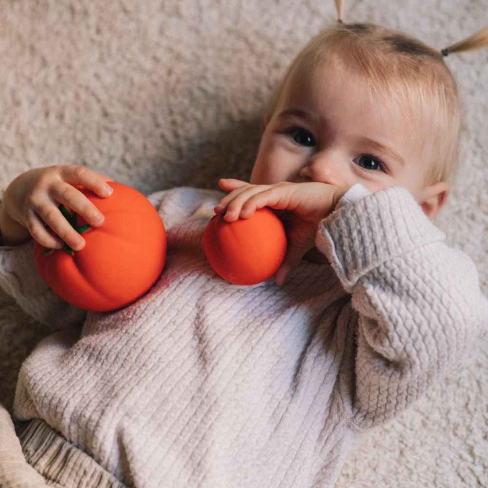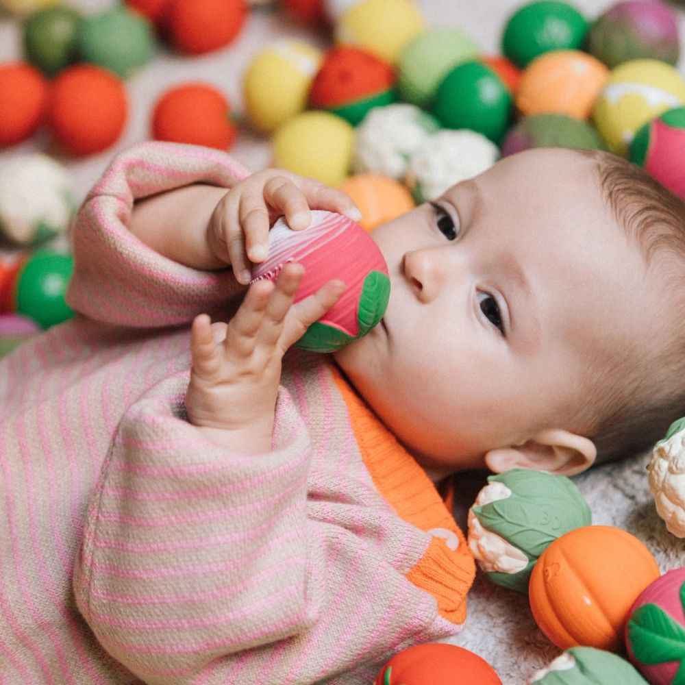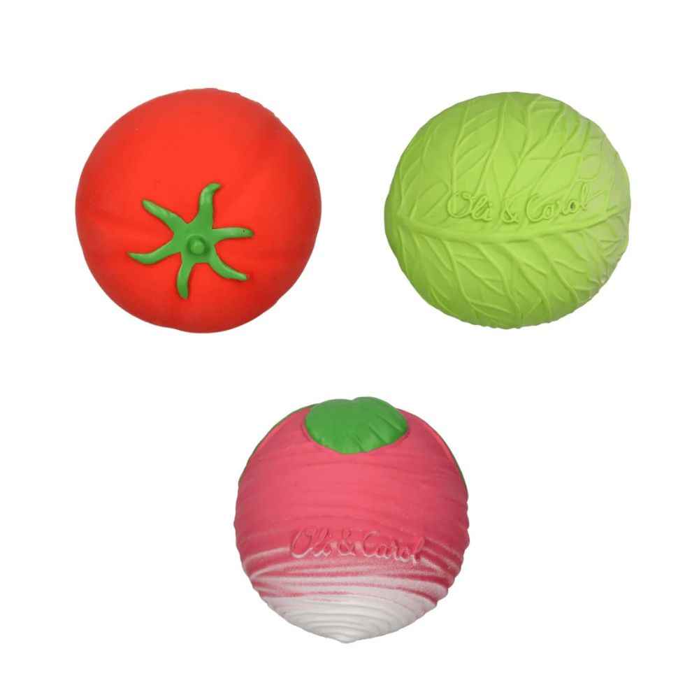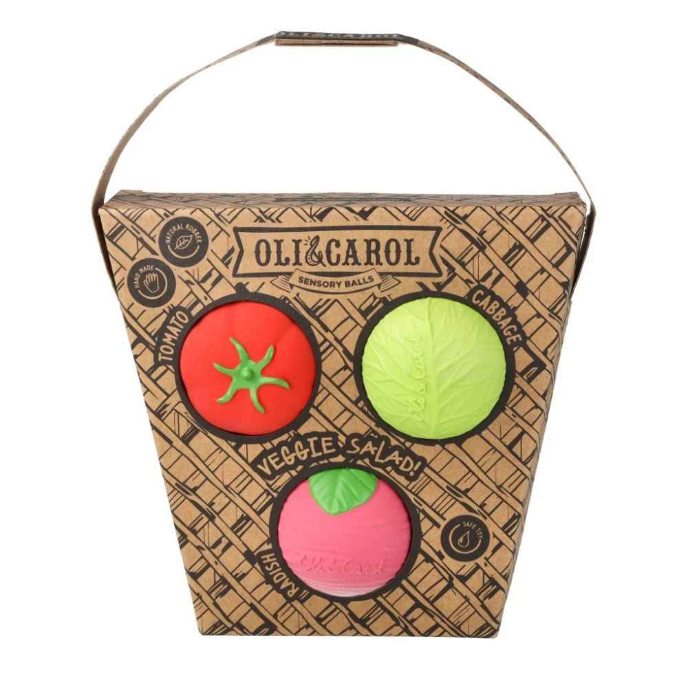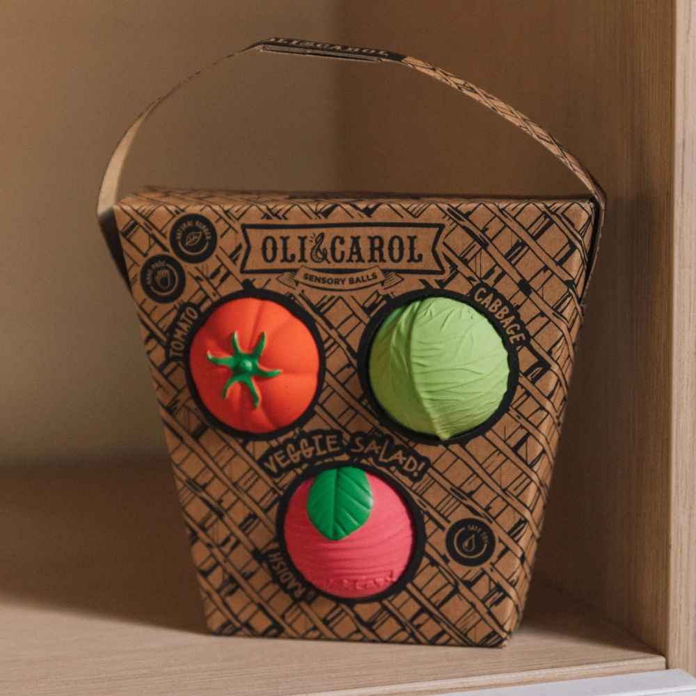Ein frischer, farbenfroher und ideenreicher „Salat“ in einer Kinderversion! Dieses Set aus drei sensorischen Minibällen von Oli & Carol (Rettich, Tomate und Kohl) ist ideal für Kleinkinder ab den ersten Lebensmonaten. Die weichen, elastischen und zu 100 % aus Naturkautschuk gefertigten Bälle fördern die sensorische und motorische Entwicklung des Kindes und helfen gleichzeitig beim Zahnen.