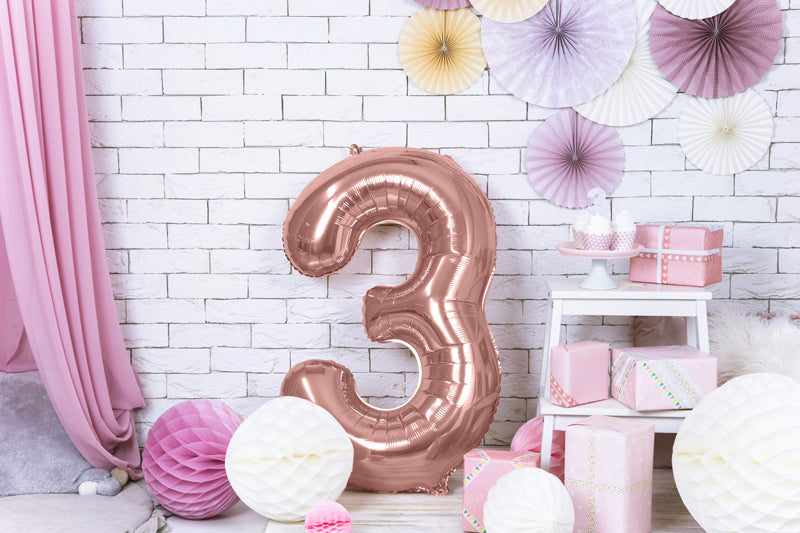 Pastellfarbene Folienballon-Zahl „3” in Roségold. Ideal als Dekoration für eine Geburtstagsfeier.