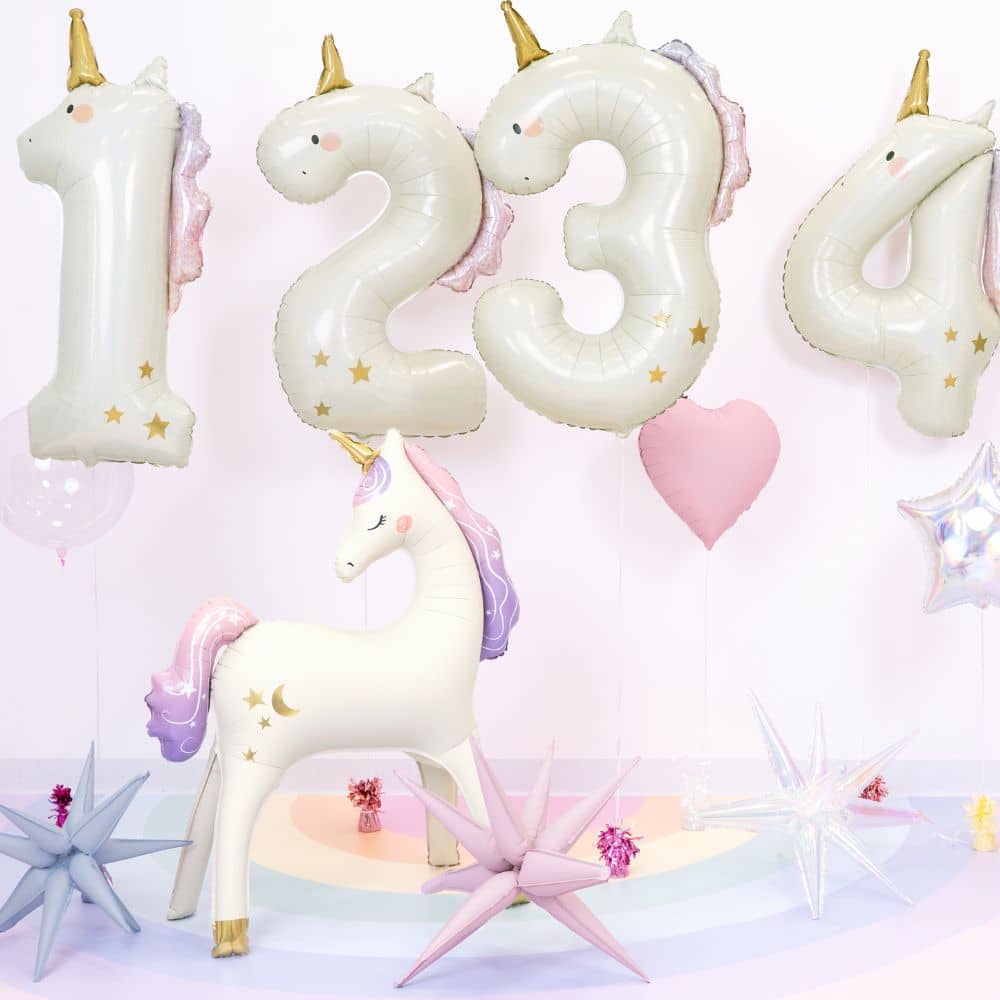 Folienballon mit der Zahl „3” und Einhornmotiv in Cremefarbe mit holografischem Effekt, verziert mit hellrosa und goldenen Details. Ideal als Dekoration für eine Geburtstagsfeier.