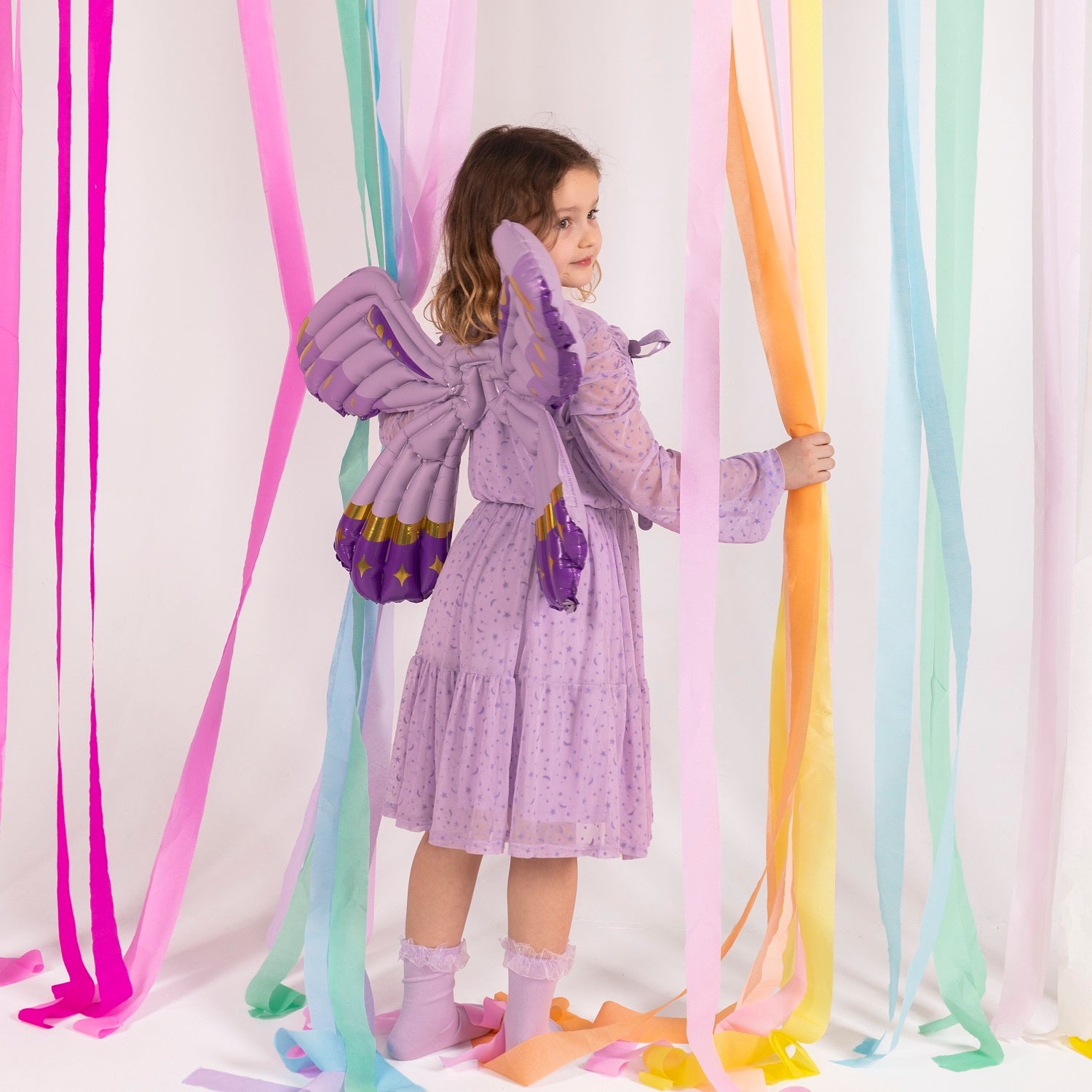 Dieser einzigartige Folieballon in Form von Schmetterlingsflügeln ist die perfekte Ergänzung für verschiedene Arten von Partys und Festen. Seine matte, violette Farbe ist ein Blickfang und verleiht ihm Charme. Dank der mitgelieferten Schnüre lässt sich der Ballon leicht am Rücken befestigen und sorgt so für ein effektvolles Schmetterlingskostüm. Im Set ist auch ein Strohhalm enthalten, mit dem sich der Ballon leicht mit Luft befüllen lässt.