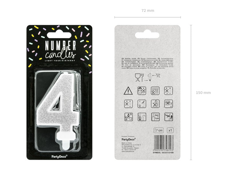 Geburtstagskerze Ziffer 4 in silbernem Glitzer. Größe ca. 7 cm. Passt zu jedem Geburtstagskuchen.