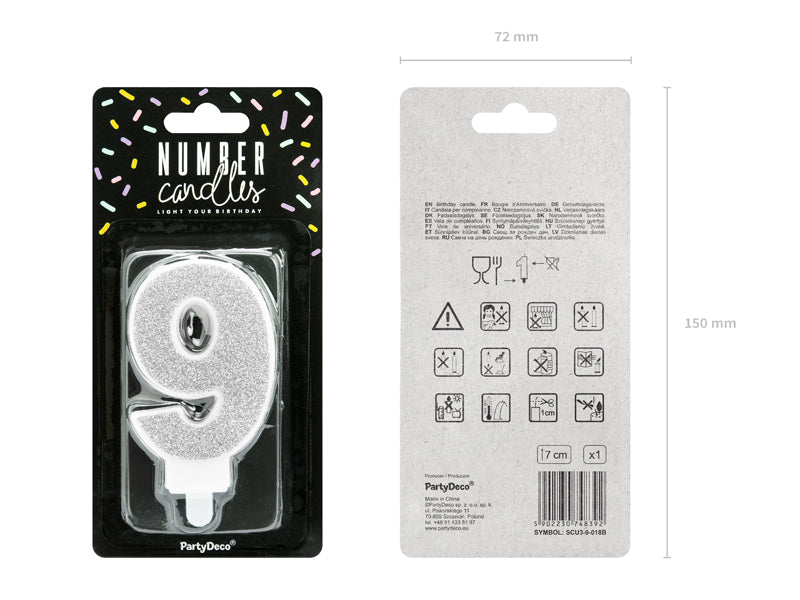 Geburtstagskerze Zahl 9 in silberner Glitzerfarbe. Größe ca. 7 cm. Passt auf jeden Geburtstagskuchen.