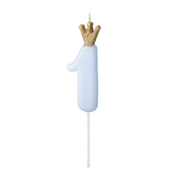 Geburtstagskerze Ziffer 1 in Hellblau mit Glitzerkrone. Passt zu jedem Geburtstagskuchen.