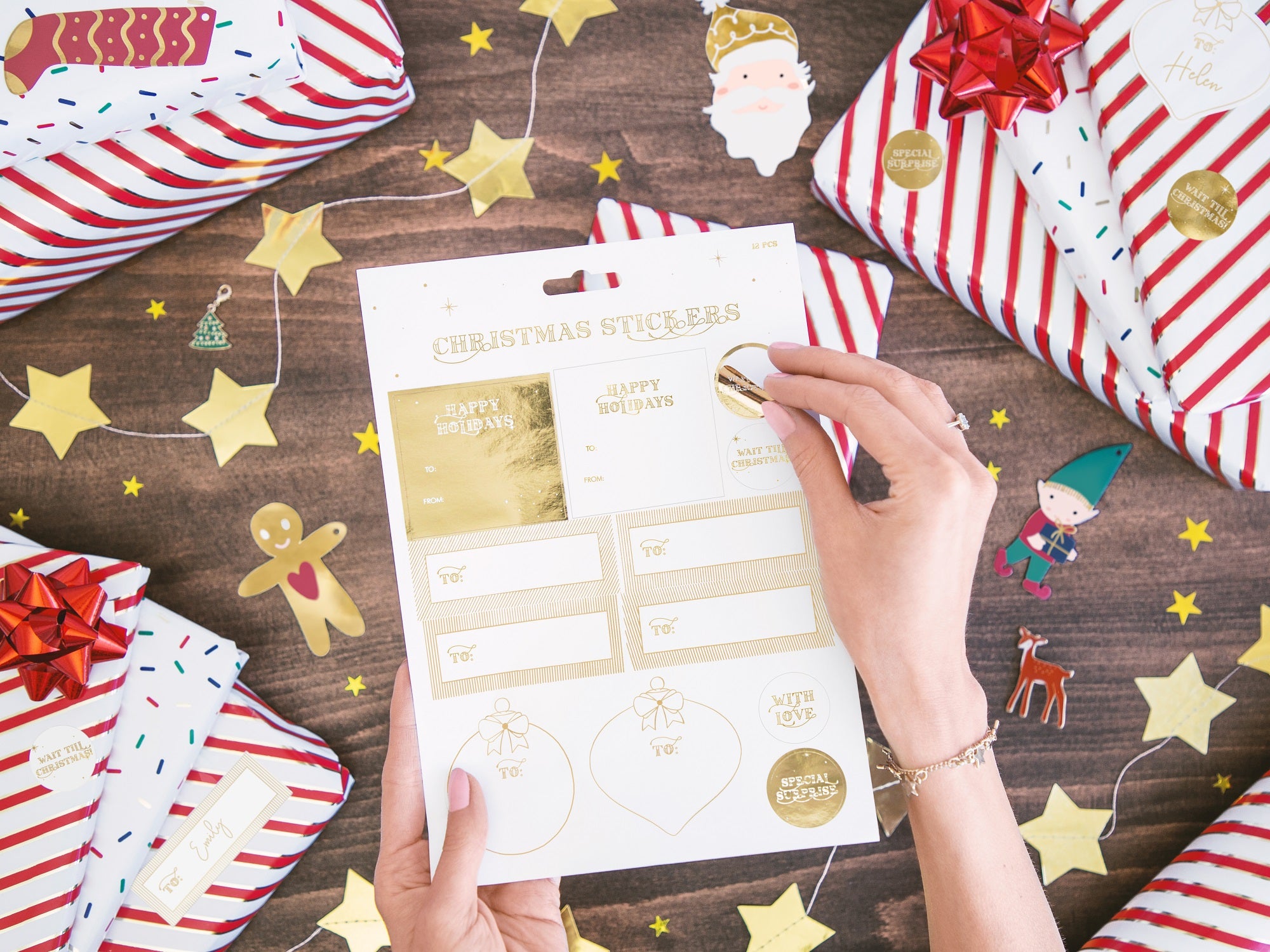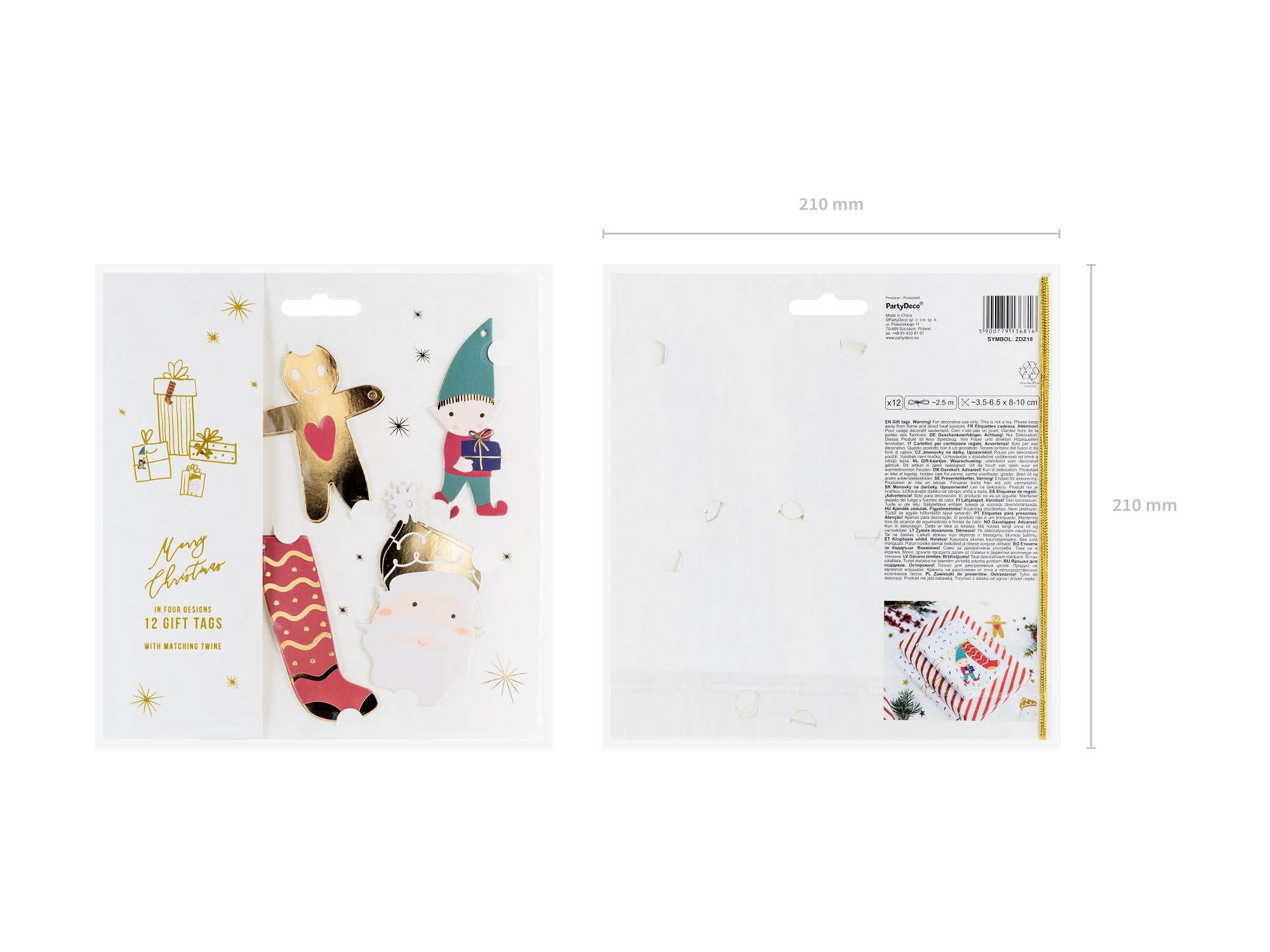 Ideal zum Kennzeichnen und Identifizieren von Geschenken, zum Schreiben von Widmungen usw. geeignet. Das Set enthält 12 Anhänger (4 Designs, je 3 Stück pro Design) und 2,5 m goldene Schnur.