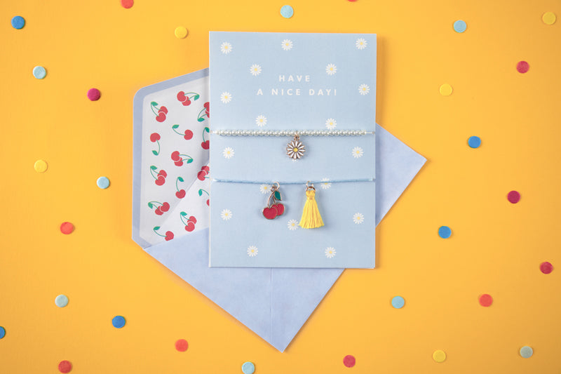 Blaue Karte mit der Aufschrift „Have a nice day!” und zwei Armbändern sowie einem blauen Umschlag mit buntem Aufdruck. Die Armbänder können abgenommen und am Handgelenk getragen werden. Die Karte eignet sich perfekt für verschiedene Anlässe.