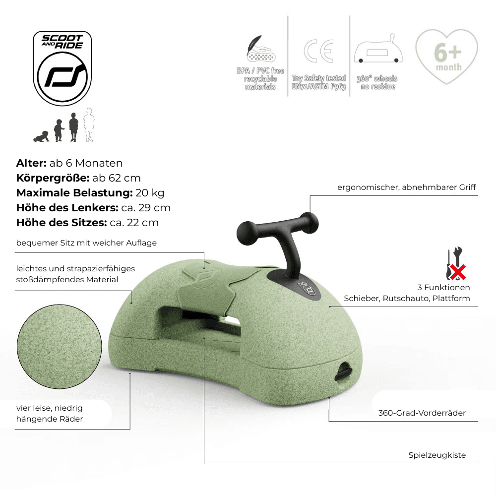 Außerdem ist das EPP-Material umweltfreundlich und kann recycelt werden. Im Gegensatz zu anderen Materialien verursacht es keine Falten an Wänden, Möbeln oder Böden und ist daher ideal für den Gebrauch zu Hause. Auf diese Weise bietet der My First Scoot & Ride nicht nur maximalen Schutz, sondern schont auch unsere Umwelt und stärkt unser Umweltbewusstsein.