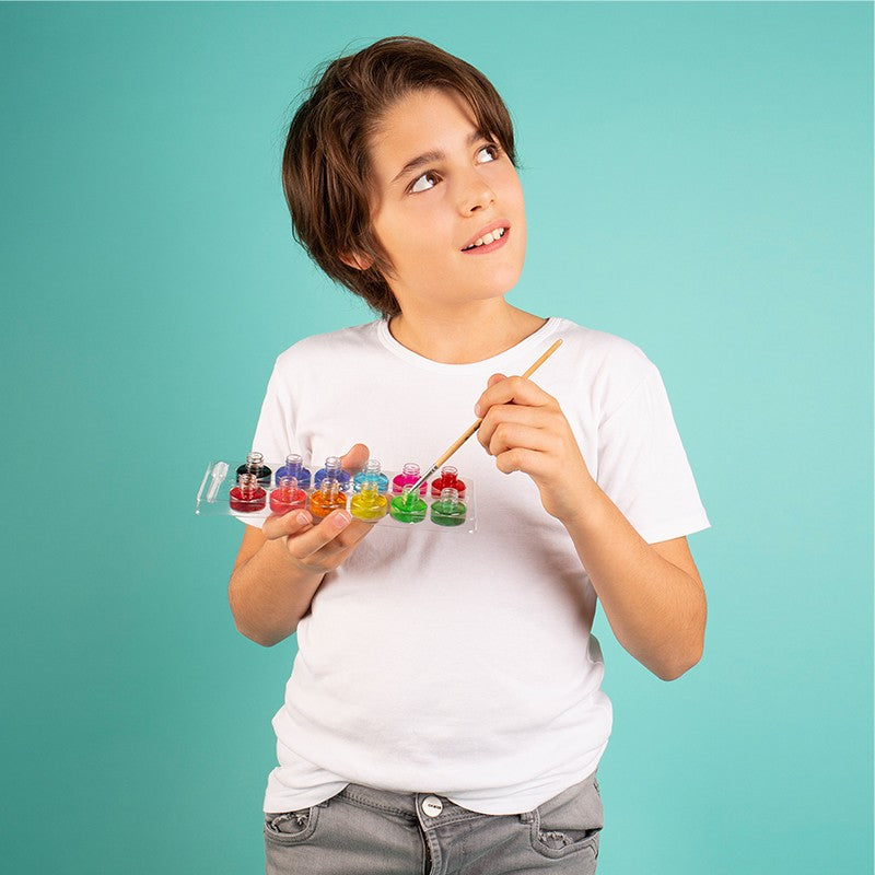 Diese Serie wurde in Frankreich mit Respekt für unseren Planeten und im Hinblick auf zukünftige Generationen entworfen und hergestellt. Die Fläschchen, die Palette und die Schachtel bestehen aus recyceltem Material und sind wiederverwertbar. Die Farben sind ungiftig und auf Wasserbasis hergestellt.