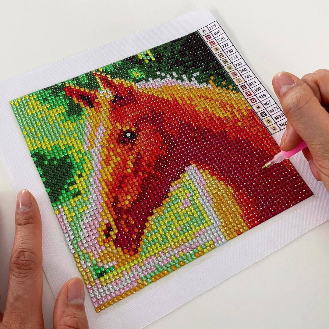 Die Technik ähnelt der Pixelkunst. Mit einem kleinen Stift nimmt das Kind die Strasssteine auf und bringt sie auf die selbstklebende Oberfläche der Leinwand auf. Die Verpackungen der Kristalle sind entsprechend beschriftet, damit sie den richtigen Feldern auf dem Bild entsprechen. Eine Illustration ist im Set enthalten. Nach Fertigstellung muss die Leinwand nur noch in den Rahmen eingesetzt werden.