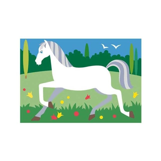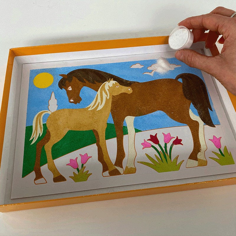 Das Set enthält: 4 Bilder mit Pferden und 15 Behälter mit farbigem Sand. Die Bilder sind selbstklebend.