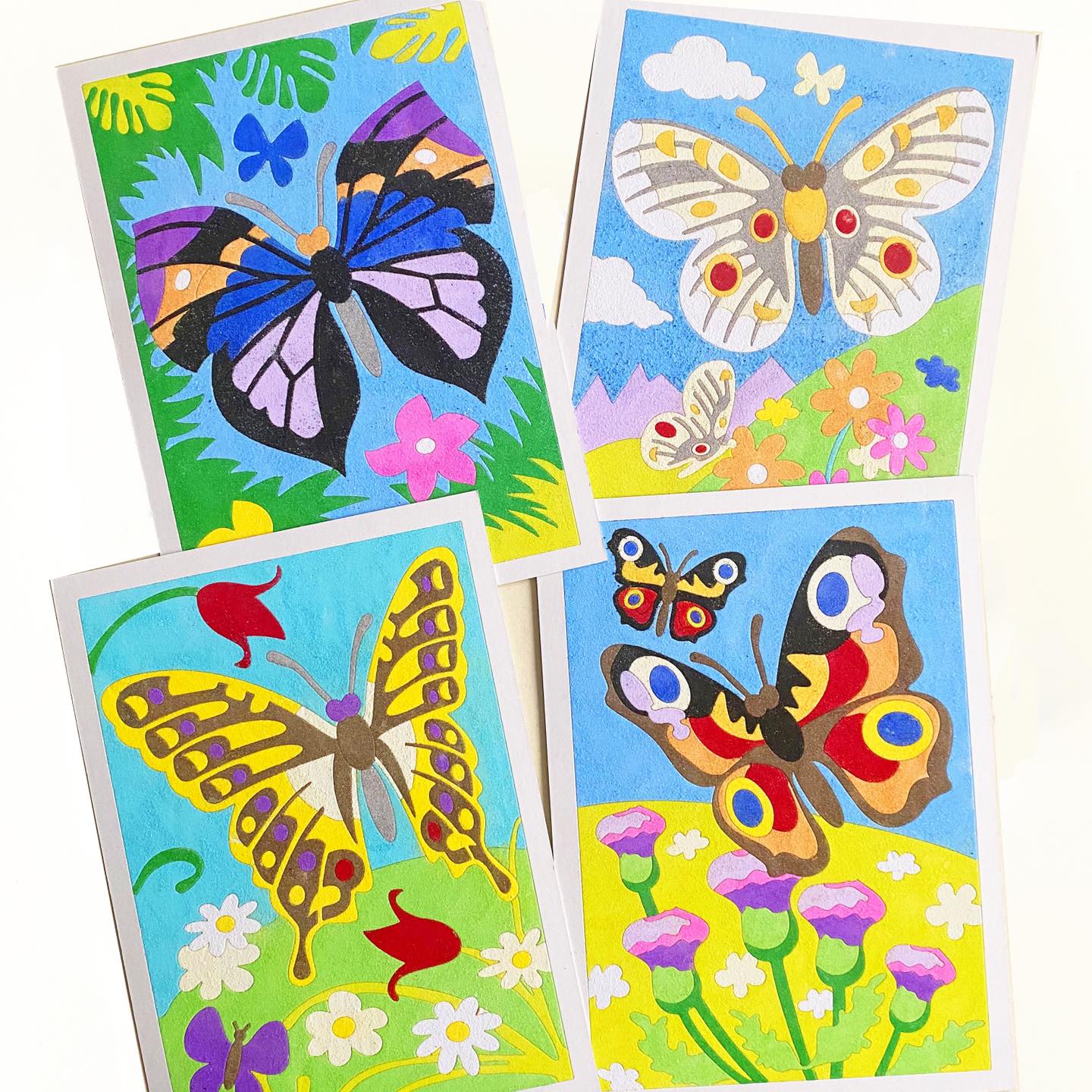 Das Set enthält: 4 Bilder mit Schmetterlingen und 15 Behälter mit farbigem Sand. Die Bilder sind selbstklebend.