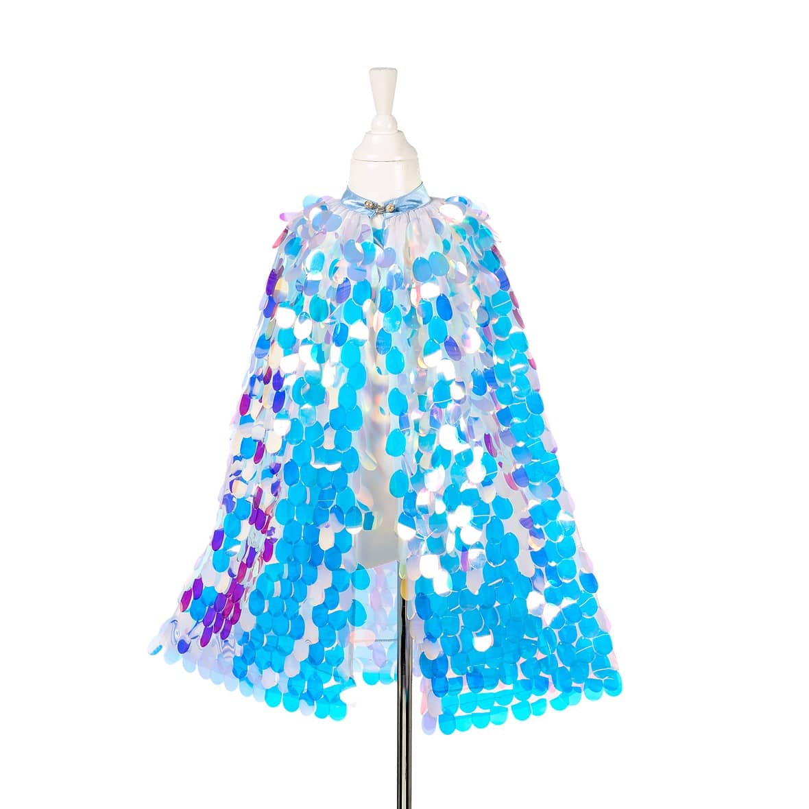 Das Meerjungfrauenkostüm Lorelie der niederländischen Marke Souza! ist ein wunderschönes, kunstvoll gefertigtes Kostüm für Mädchen. Der Umhang besticht durch seine Liebe zum Detail. Er ist auffällig, aus luftigem Tüll genäht und mit großen holografischen Pailletten in Blau und Violett (die Meerjungfrauen-Schuppen imitieren) besetzt. Er wird unter dem Hals mit Knöpfen mit Schlaufen – Perlen – geschlossen. Angenehm zu tragen.