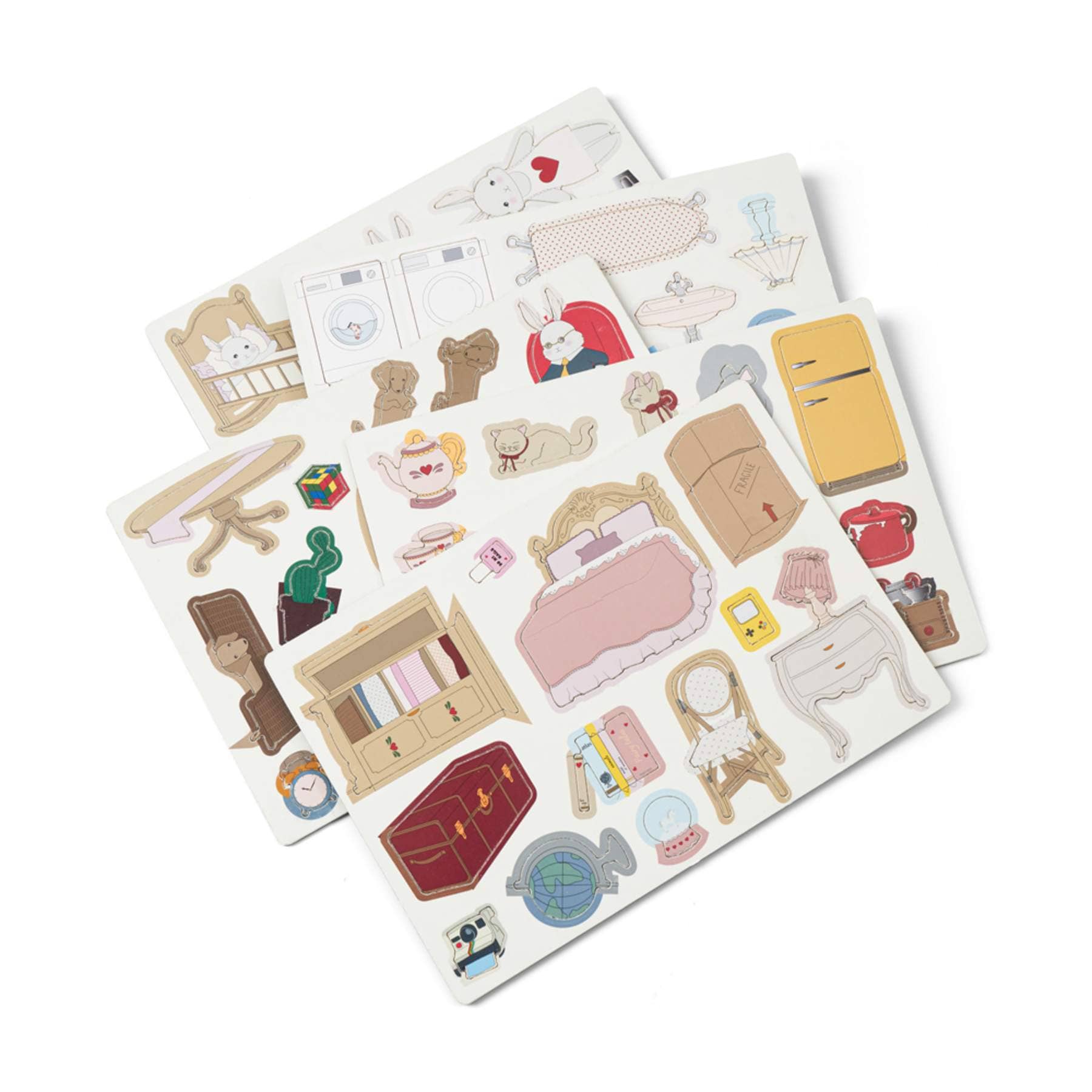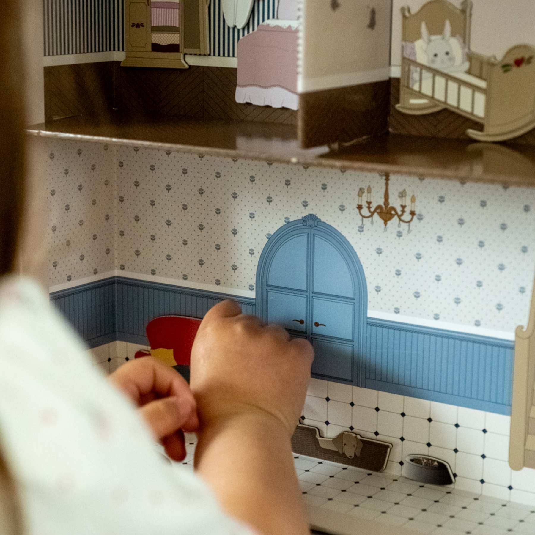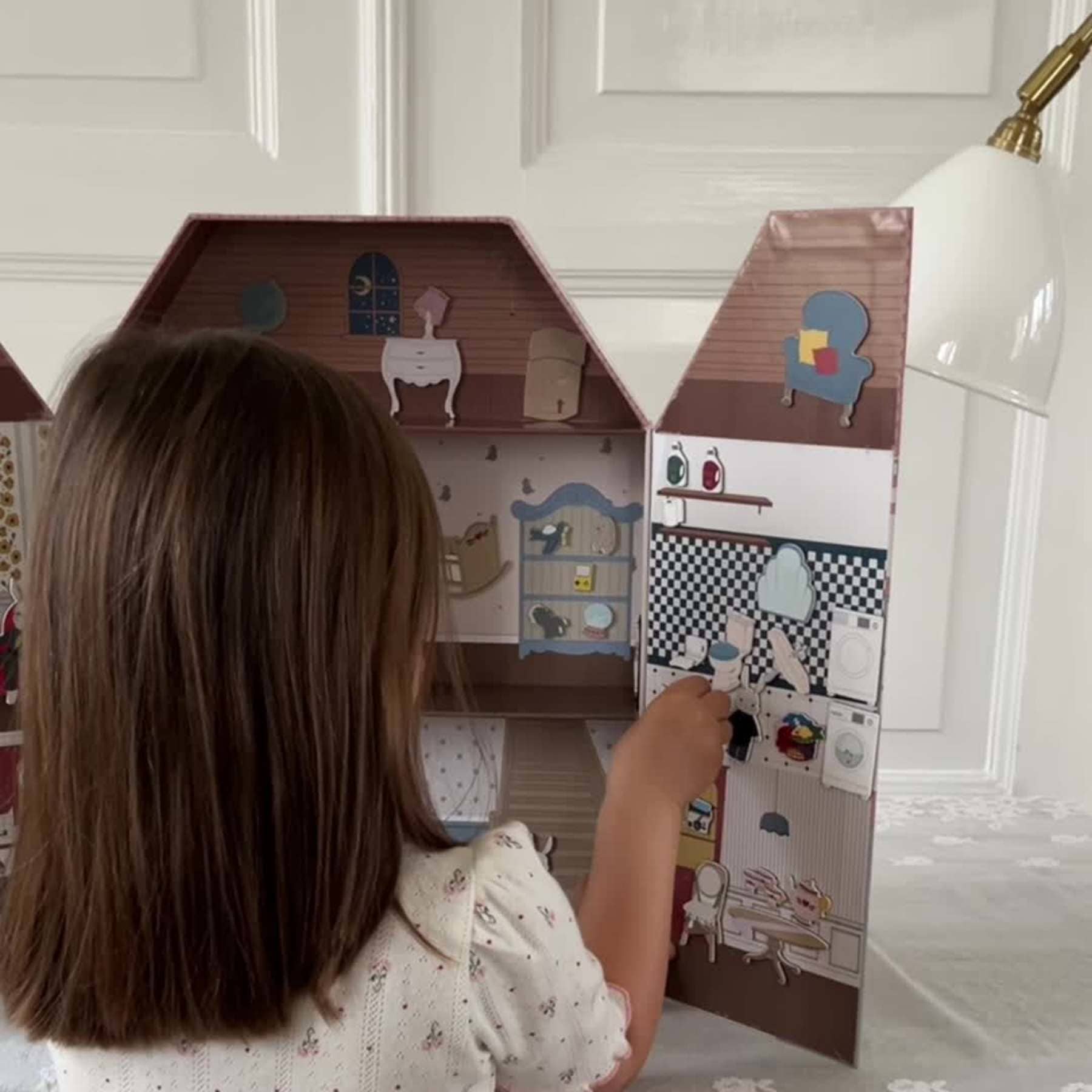 Die Außenseite des Häuschens besticht durch Pastelltöne und dezente florale Details. Öffnet man es, kommen drei Etagen voller bunter Zimmer zum Vorschein. Das Innere jedes Zimmers ist mit bezaubernden Illustrationen von Möbeln und Accessoires geschmückt, die einen perfekten Hintergrund für eigene Geschichten und Rollenspiele bieten.