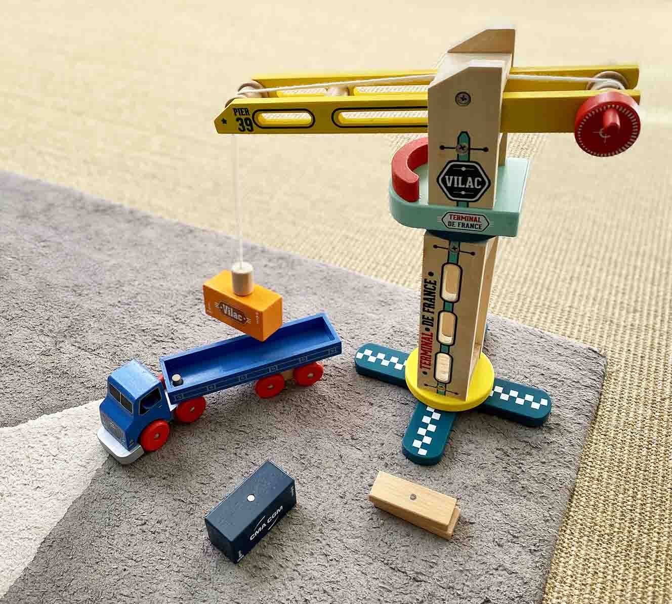 Das ideale Set für kleine Autoliebhaber. Der Kran verfügt über eine drehbare Kabine, auf der einen Seite befindet sich eine Winde zum Absenken von Containern, auf der anderen Seite eine Schnur mit einem Magneten am Ende. Im Set enthalten sind zwei Container und zwei Bretter. Der Kran ist mit anderen Fahrzeugen der Marke Vilac zum Spielen mit Bauwerken kompatibel.